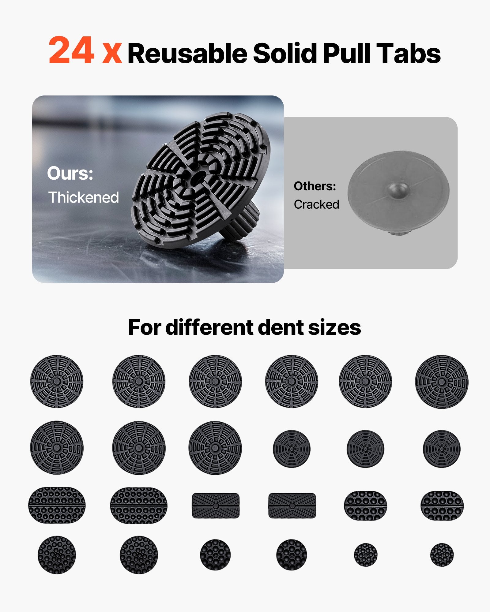 - Works on Various Dents: This paintless dent removal kit comes with multiple sizes of pull tabs, handling tiny hail dents and medium-sized collision dents. The solid rubber tabs are tough and reusable, and grip tightly without damaging your paint