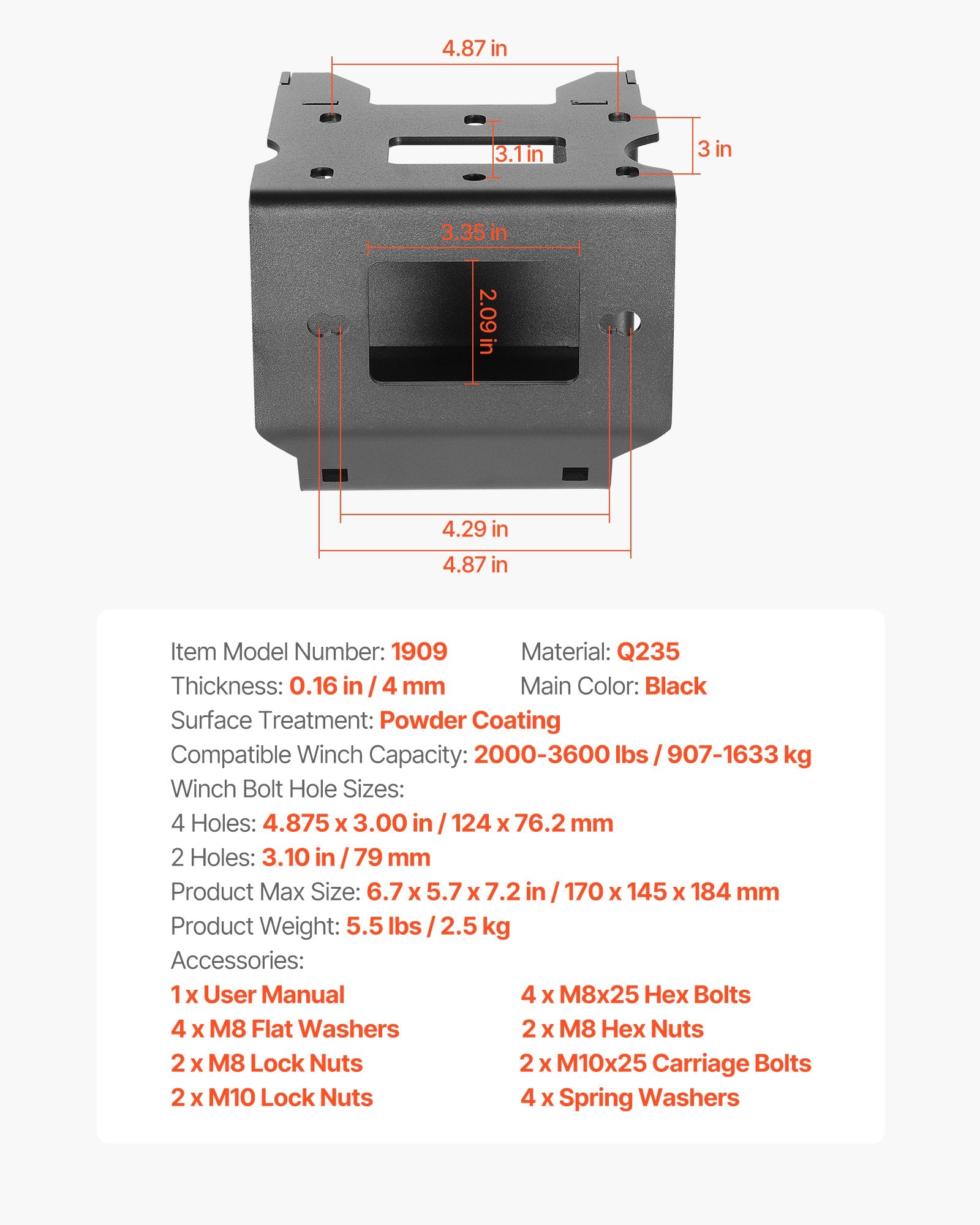 - 2 Winch Mounting Holes: The trailer winch mount supports 4-hole standard (4.9 x 3.0 inches) and 2-hole standard (3.1 inches) hole configurations. The versatile design fits most standard winches, ensuring broad compatibility for different user needs