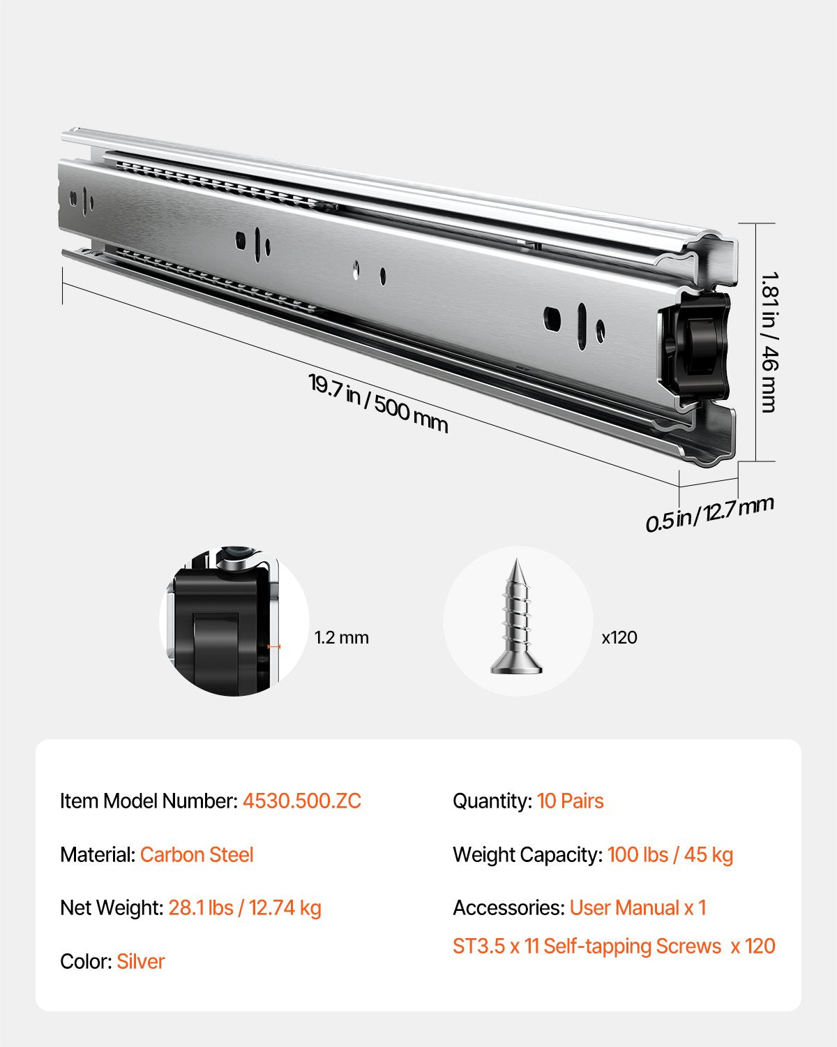 Drawer Slides, 20 inch, 10 Pairs Full Extension Ball Bearing Cabinet Rails, 100 LB Load Capacity Heavy Duty Side Mount Dresser Drawer Slides, Drawer Track Runners for Kitchen DIY Replacement