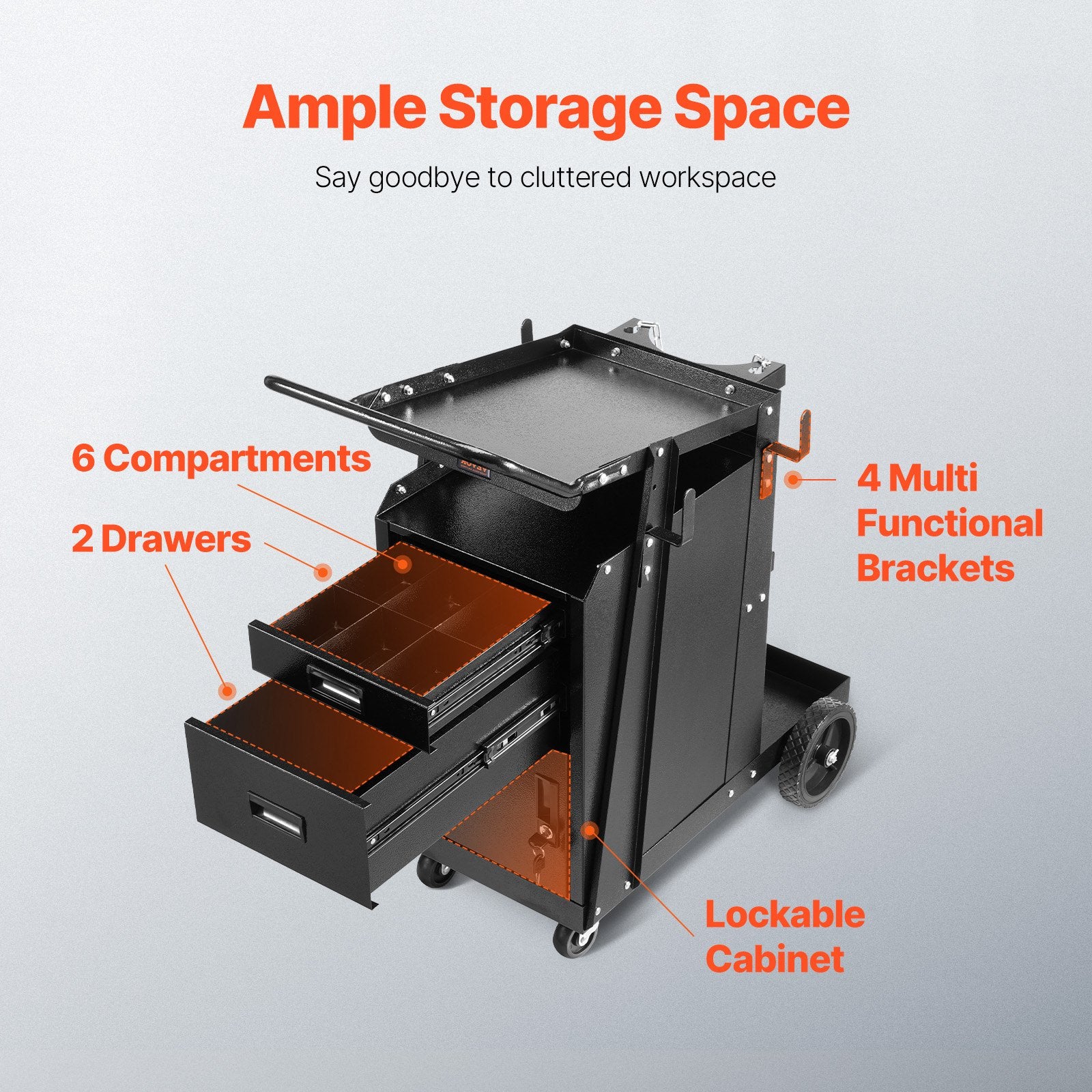 - Strong Weight Capacity: VEVOR welding cart with drawers supports up to 350 lbs of static weight and 300 lbs of dynamic weight with ease. Effortless handling various heavy loads, it’s perfect for storing and transporting MIG, TIG welding machine, plasma cutter and more welding equipment, meeting the needs of demanding professional tasks.