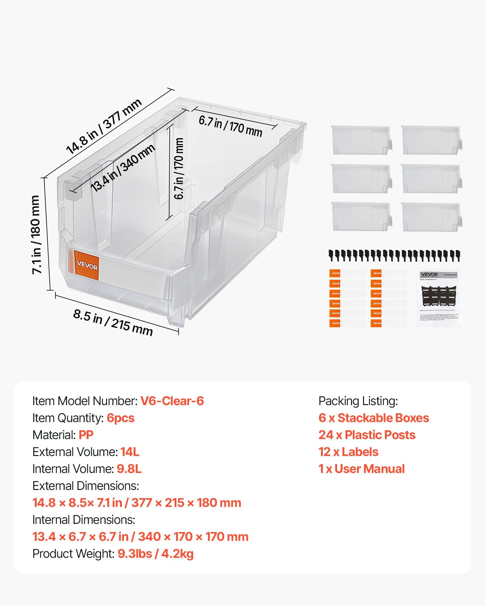 Plastic Stackable Storage Bins, 37.7 x 21.5 x 18 cm (6 Pack), Plastic Containers for Organizing & Storage Bins for Closet, Garage, Small Parts, Office Supplies, Other Accessories, Transparent
