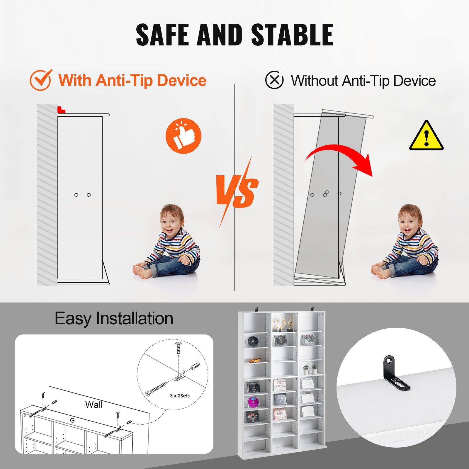 - Stable Design: Our DVD shelf is equipped with a widened base for enhanced stability, preventing wobbling. It includes an anti-tip design to secure against accidental bumps, ensuring your collection remains safe during everyday use.