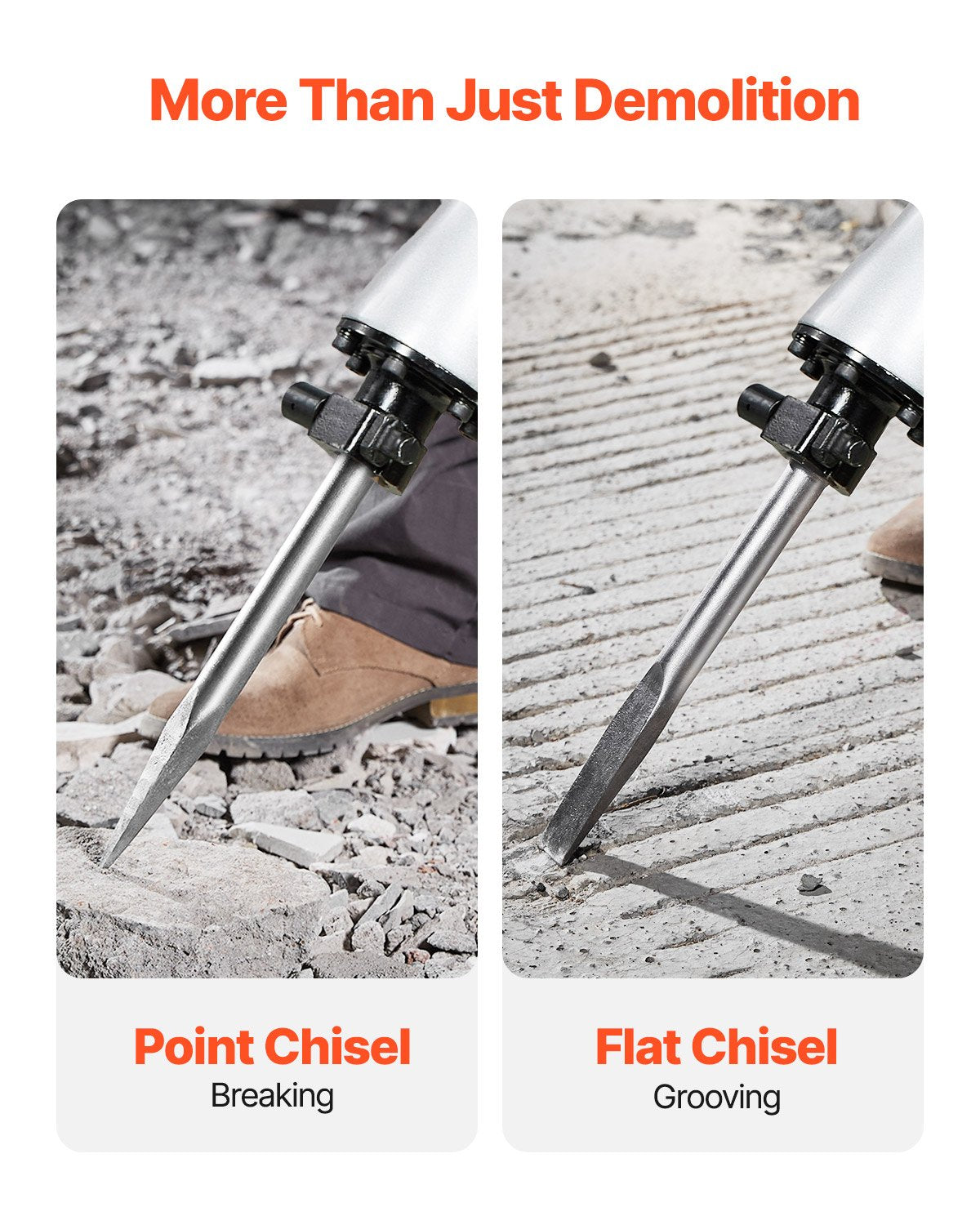 - Versatile Chisels: Our electric jackhammer includes two chisels: flat and point. Designed to handle demolition, trenching, and other tasks on concrete, masonry, brick, tile, and plaster. Ideal for pipe, mechanical, and plumbing installations