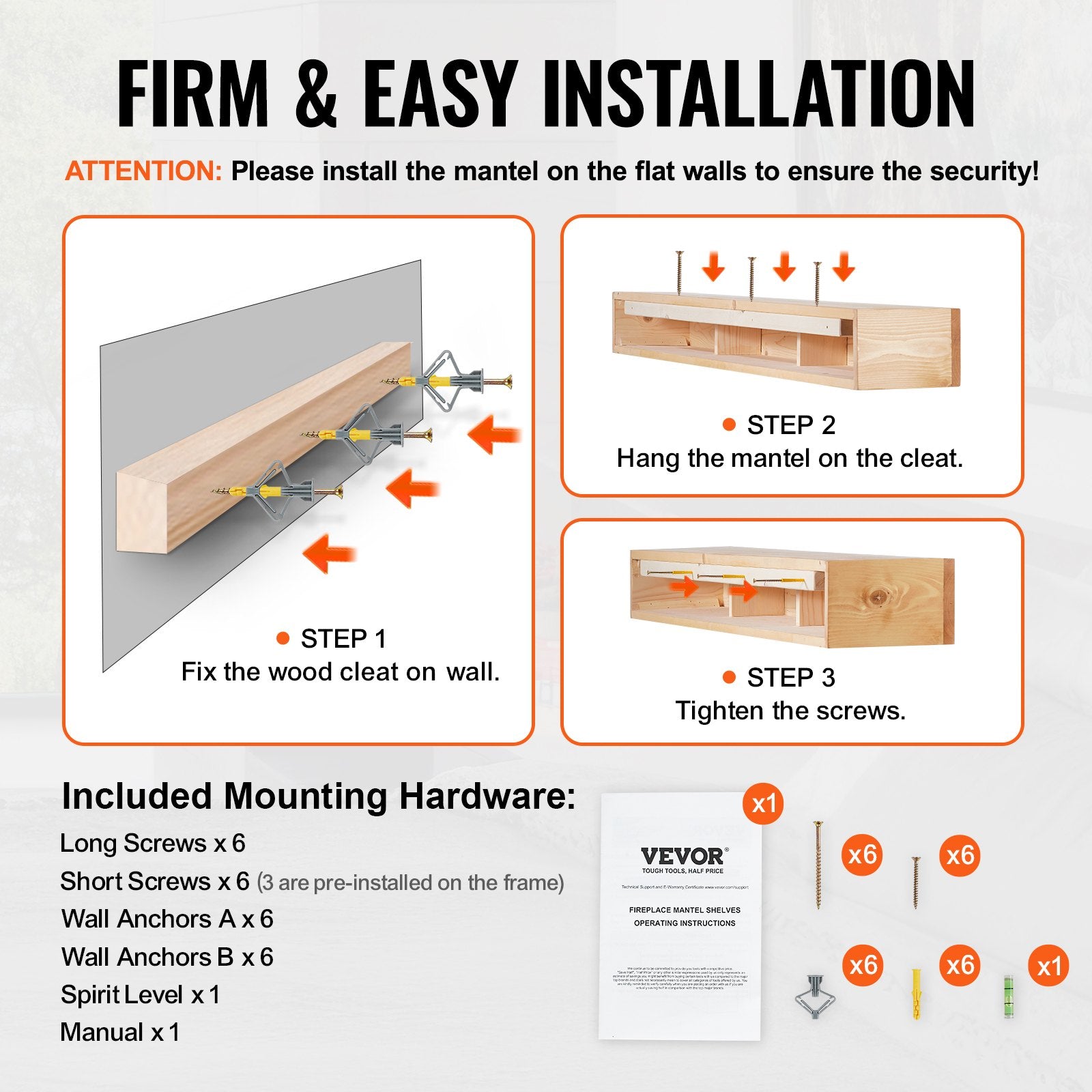 - Easy to Install: For secure and straightforward installation, please ensure the wood mantel is mounted on flat walls. All necessary mounting hardware is included, making the assembly process quick and hassle-free.