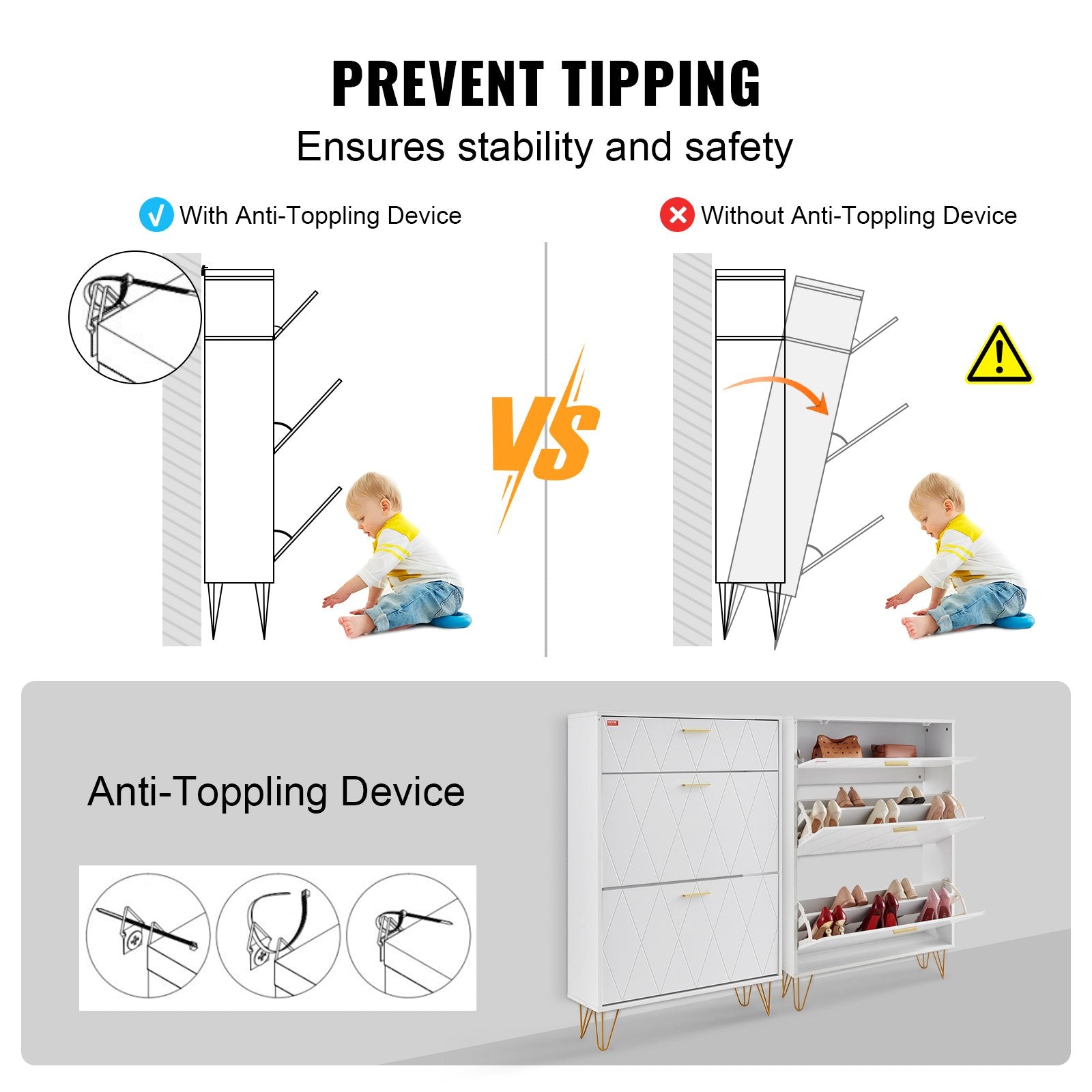 - Easy Assembly: The shoe organizer cabinet is designed for straightforward assembly, complete with detailed instructions and illustrations to make the process hassle-free. The anti-toppling feature ensures added stability and safety, providing you with a reliable shoe organization solution.