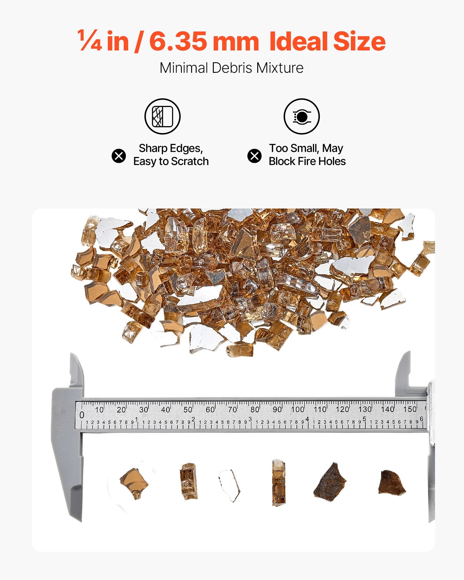 - Vibrant Colors: 10 lbs / 4.5 kg of Copper reflective crushed tempered fire pit glass, size 1/4 in / 6.35 mm. It adds a luxurious touch to any setting, shining bright by day and flickering warmly by night, creating a cozy and romantic atmosphere