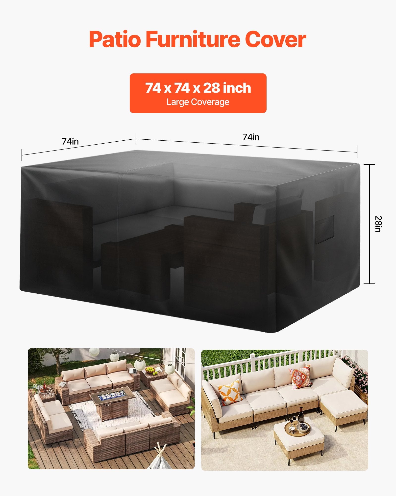 - Universal Fit: This 74"L x 74"W x 28"H patio furniture cover fits most furniture like coffee tables, chairs, sofa, couch, and more. It provides full coverage and protection. Please check your furniture's dimensions for proper fit