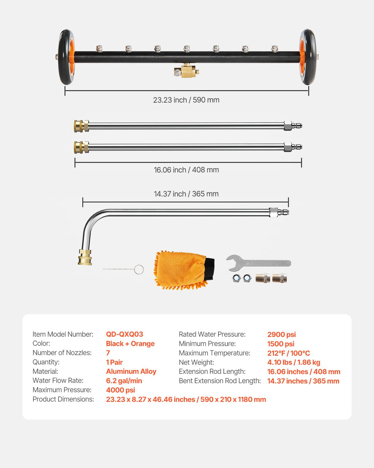 - 4000 PSI High Water Pressure: With a rated water pressure of 2900 PSI and a maximum pressure of 4000 PSI, this power washer surface cleaner can handle hot water up to 100°C, making it ideal for winter cleaning. It quickly removes dirt and debris without damaging your vehicle’s undercarriage.