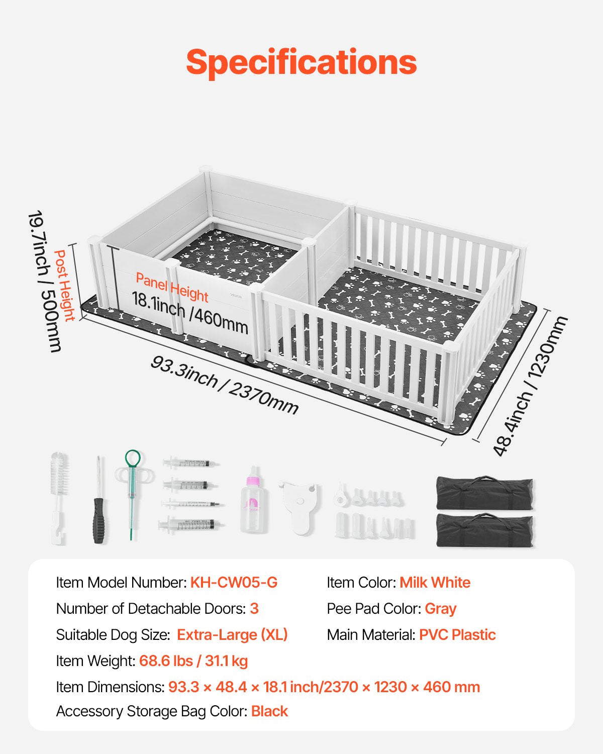 Dogs Whelping Box, 93.3x48.4x18.1 inch, Plastic PVC Puppies Playpen with Height Adjustable Door and Washable Pee Pad, 2-Room Layout Indoor Puppy Play Pen for Extra Large Breed Dogs, Milk White
