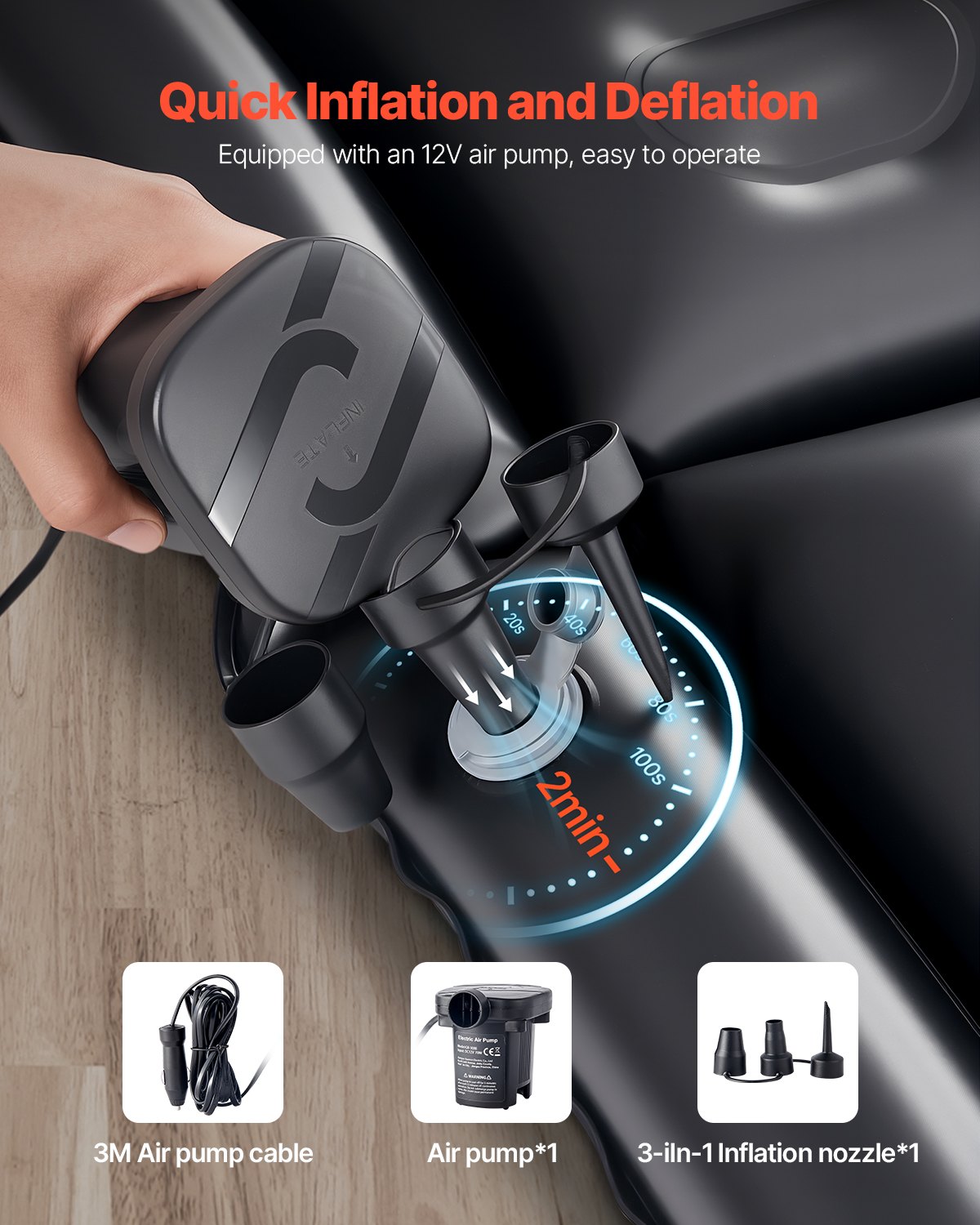 - Quick Inflation: It only takes 2 minutes to fully inflate and start using the portable sleeping pad. The quick inflation travel bed is equipped with an external air pump and a three-in-one nozzle for easier operation. The air pump has a 3-meter long cord, allowing for long-distance inflation without the need for additional tools.