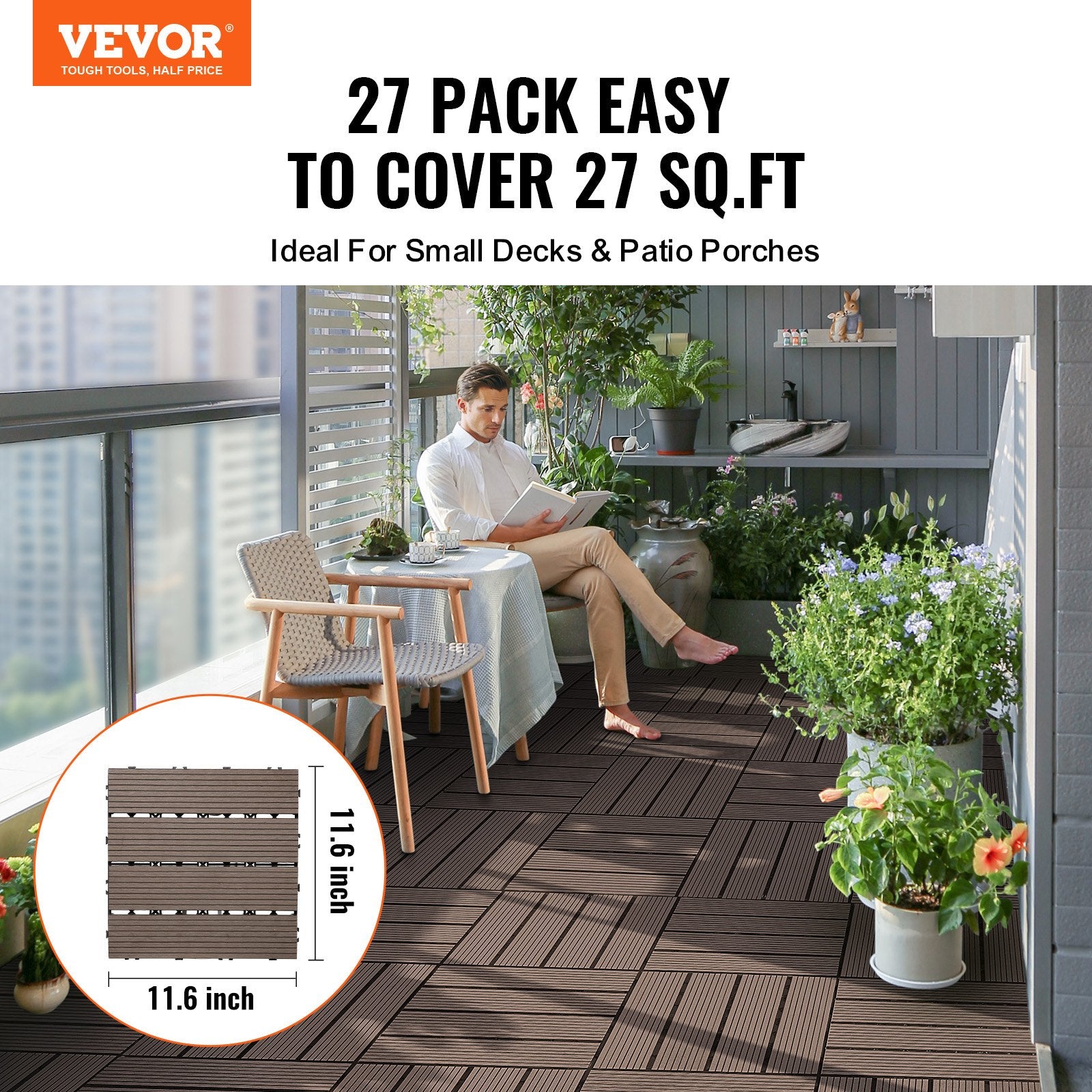 Interlocking Deck Tiles Plastic Wood, 27 Pack,12"x12" 27 sq. ft Waterproof Outdoor Flooring All Weather Use, Patio Floor Decking Covering Tiles for Porch Poolside Balcony Backyard, Dark Brown
