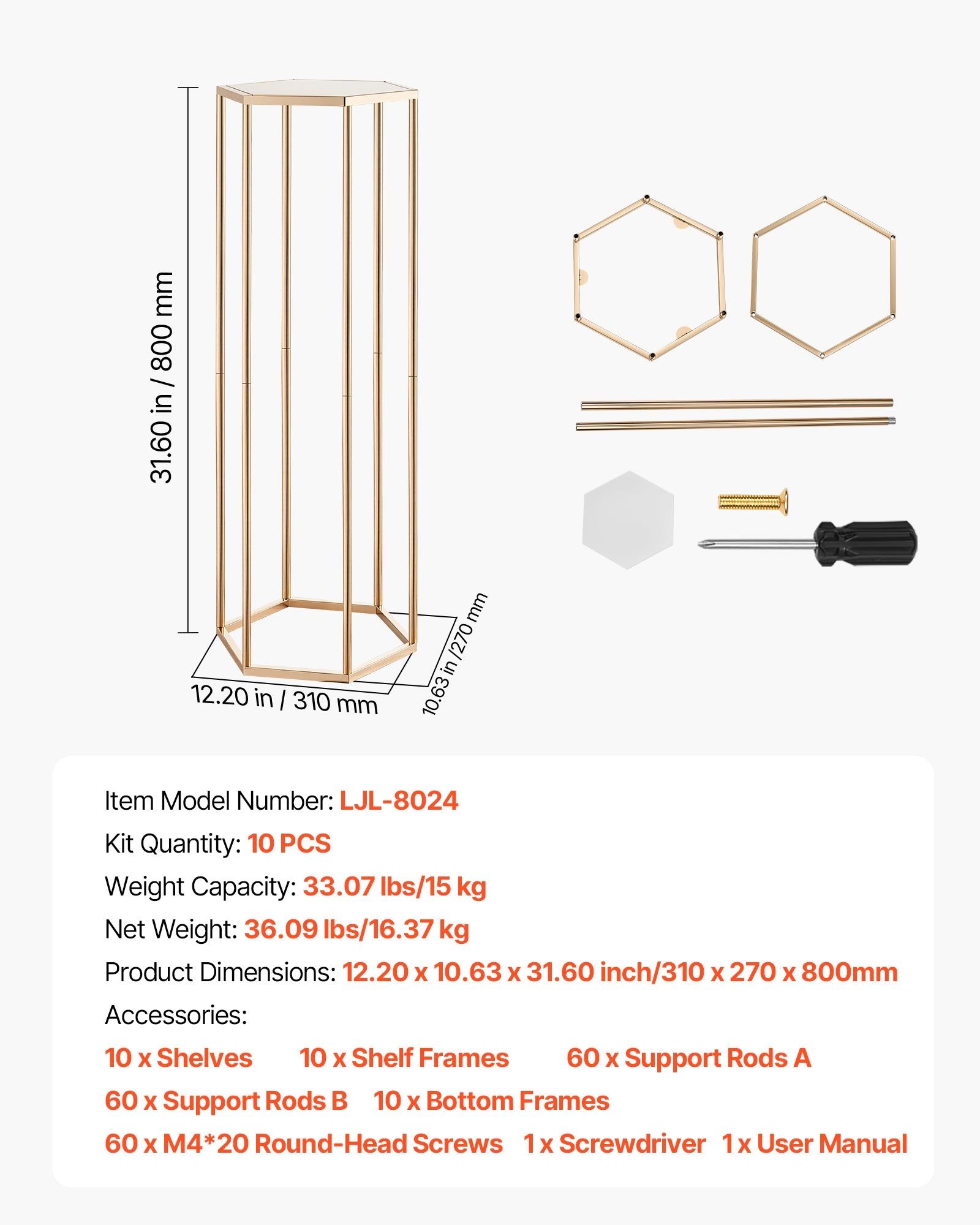 - Elegant Design: Featuring a classic hexagonal cube design, our geometric centerpiece stand offers an elegant appearance while evenly distributing weight for stability. With a weight capacity of 33.07 lbs/15 kg, it ensures secure placement of your décor, adding a unique touch to weddings, parties, or celebrations