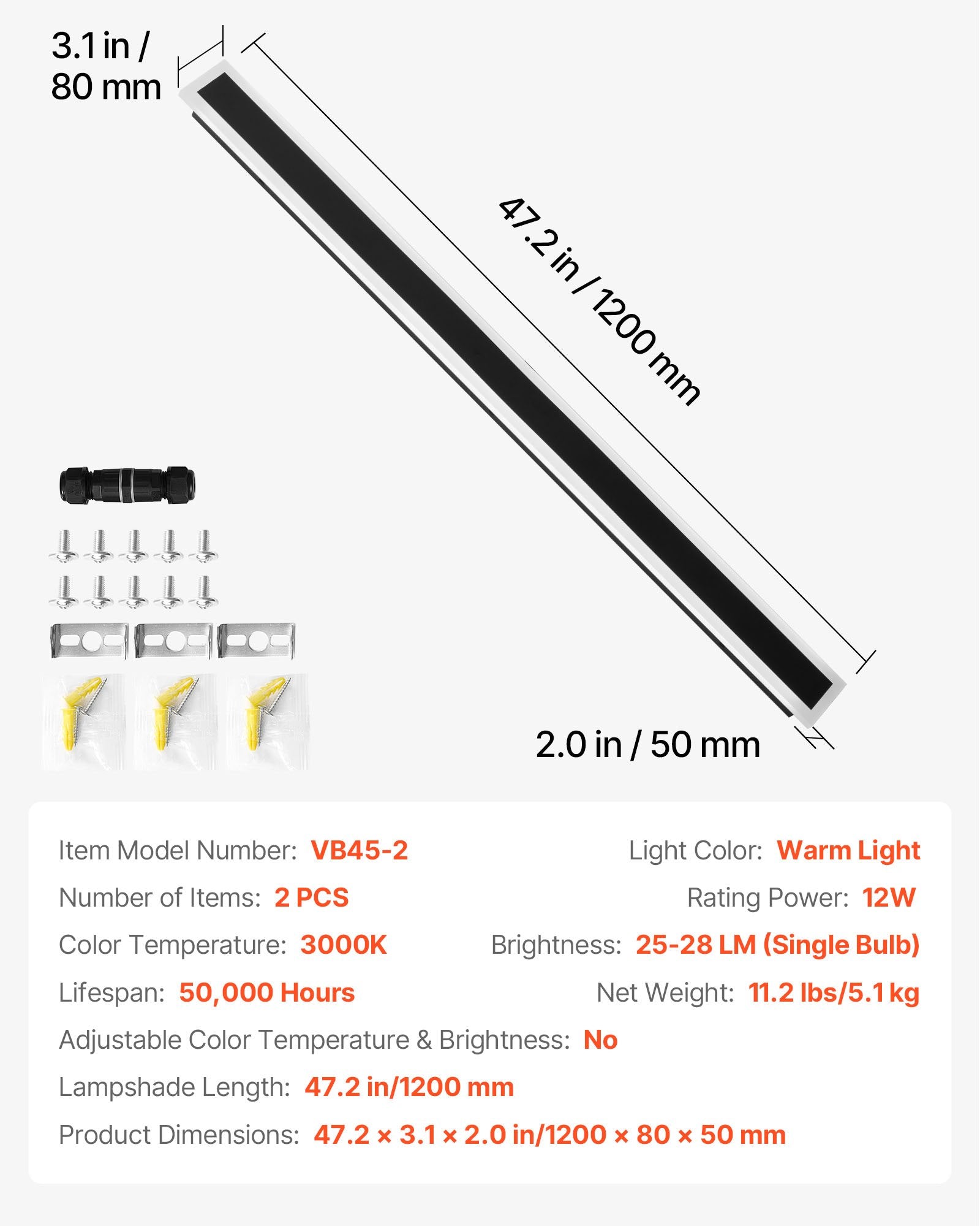 Outdoor Wall Lights, 2 Pack, 1200 mm Long Strip Modern Exterior Wall Sconce Light Fixtures, 3000K Warm White, IP65 Waterproof Anti-Rust Outside Wall Mount Lighting, for House, Porch, Garage