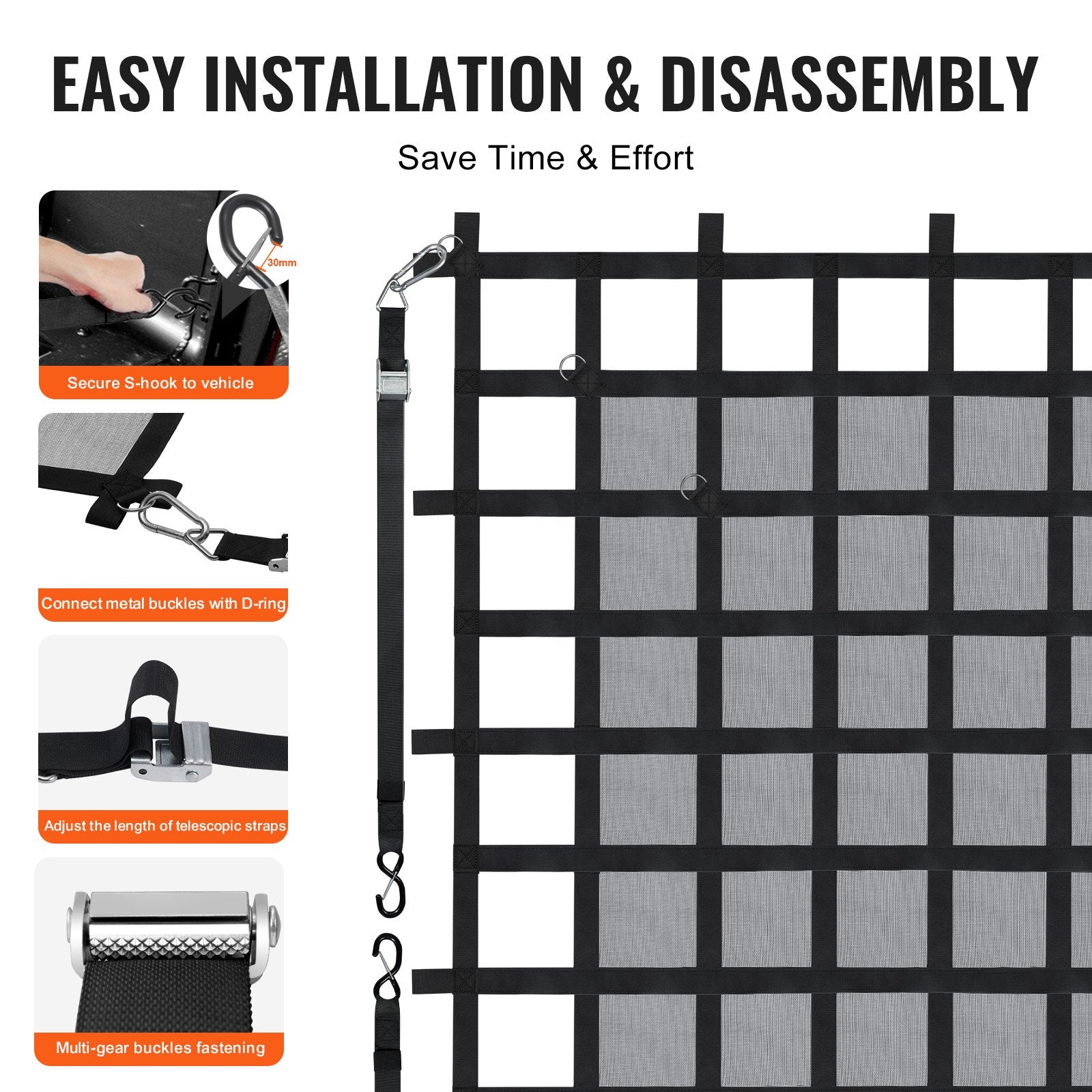 - Easy Installation for Various Vehicles: Using the 4 S-hooks in the accessories to connect the vehicle, you can easily secure the cargo net to various vehicles for use, whether it's a truck, trailer, pickup, jeep, SUV or even a boat. (Tip: Make sure that you've secured the anchors or bolts on your vehicle!)