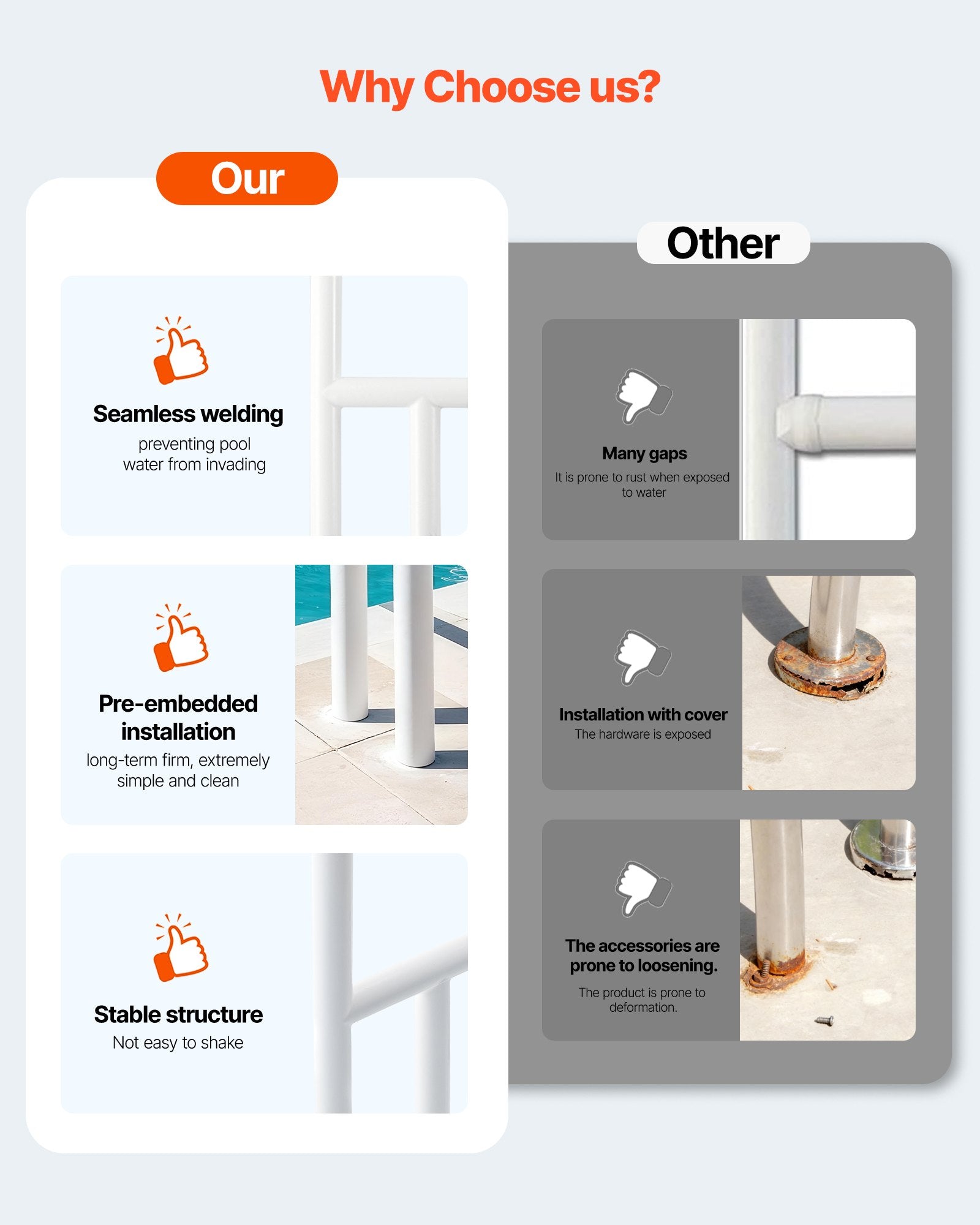 - 220 lbs Heavy-Duty Load: Our pool handrail ensures security entry and exit from your pool. Whether pulling up, supporting from the side, or pressing down vertically, the swimming pool rail distributes weight evenly, resisting breakage or deformation