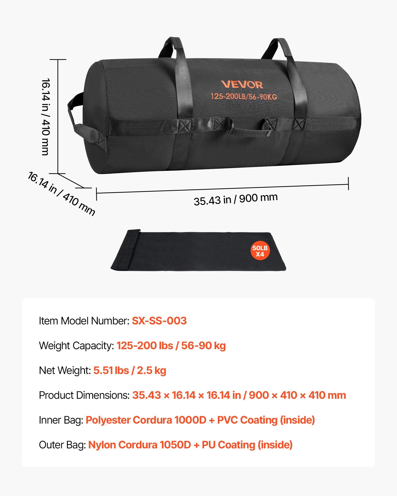 - Tear-Resistant & Durable: Our workout sandbag is made with high-quality materials, featuring a polyester Cordura 1000D inner bag with a PVC coating and a nylon 1050D Cordura outer bag. Reinforced connections and full-length handles ensure reliability