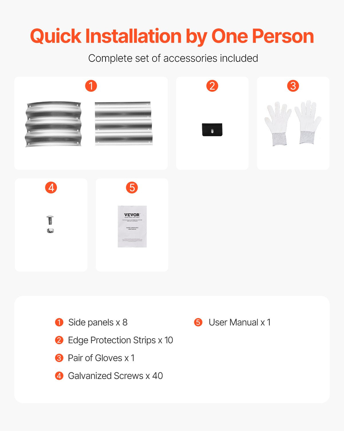 - What You'll Get: Our raised garden bed includes 8 side panels, 10 edge protection strips, 1 pair of gloves, 40 galvanized screws, and a user manual.