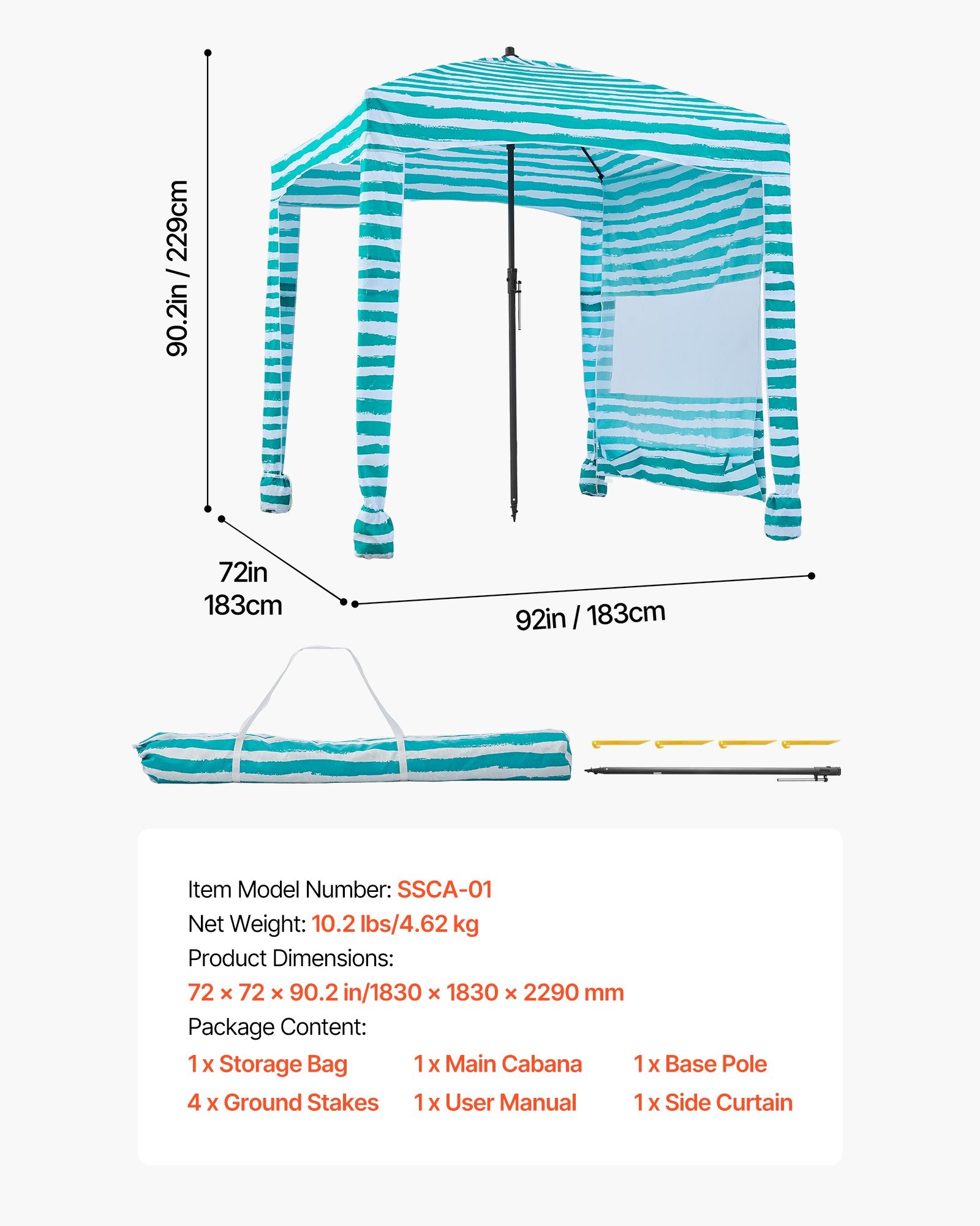 - 6 x 6 ft Beach Cabana: This spacious beach cabana with a side curtain comfortably accommodates two people, chairs, and gear. Designed with storage pockets, it keeps phones, sunglasses, and sunscreen within easy reach