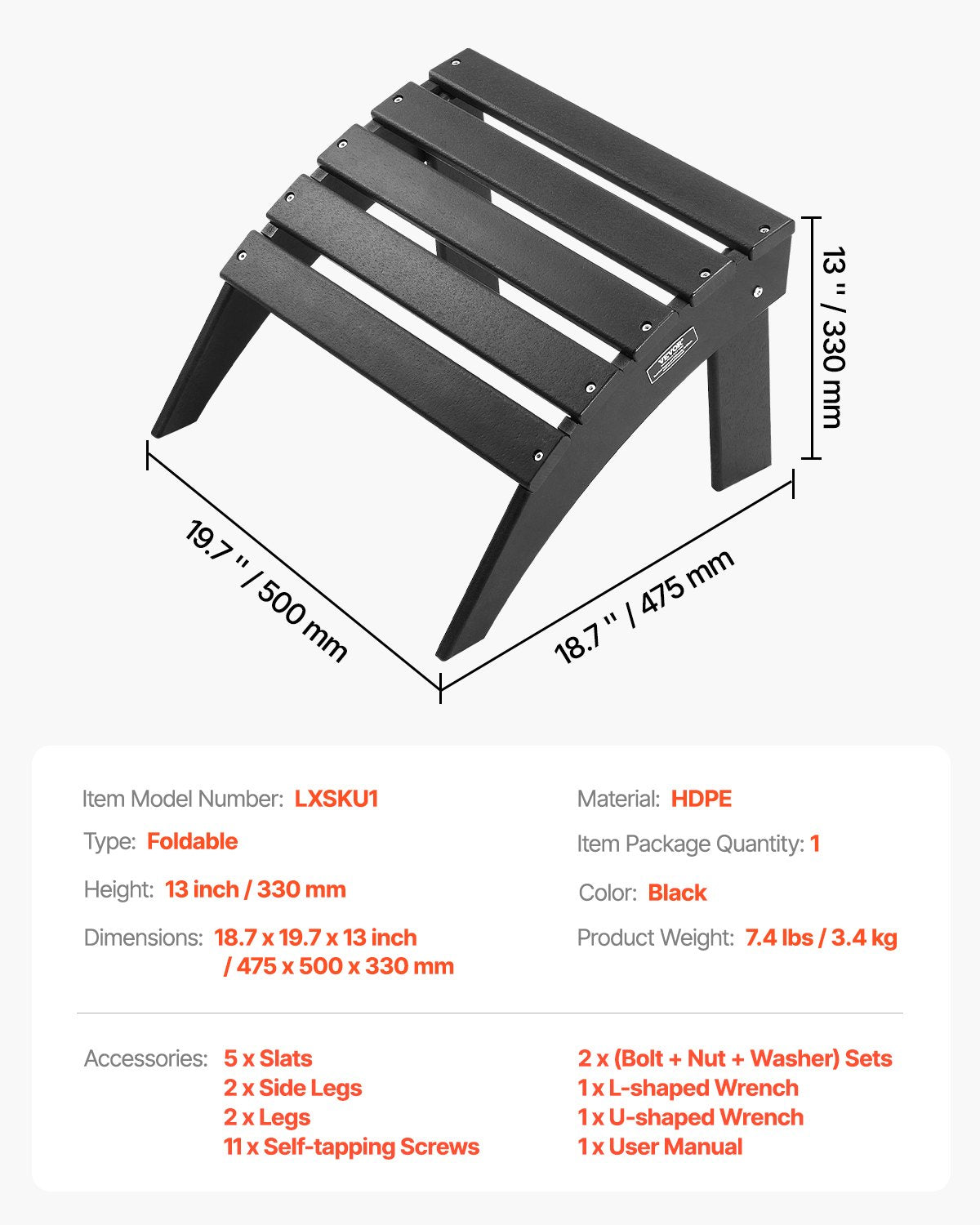 Adirondack Ottoman, 18.7L x 19.7W x 13H Inch HDPE Plastic Folding Adirondack Ottoman, Weather-Resistant Foot Rest for Adirondack Chair, Widely Used for Outside Porch Pool Lawn Backyard, Black