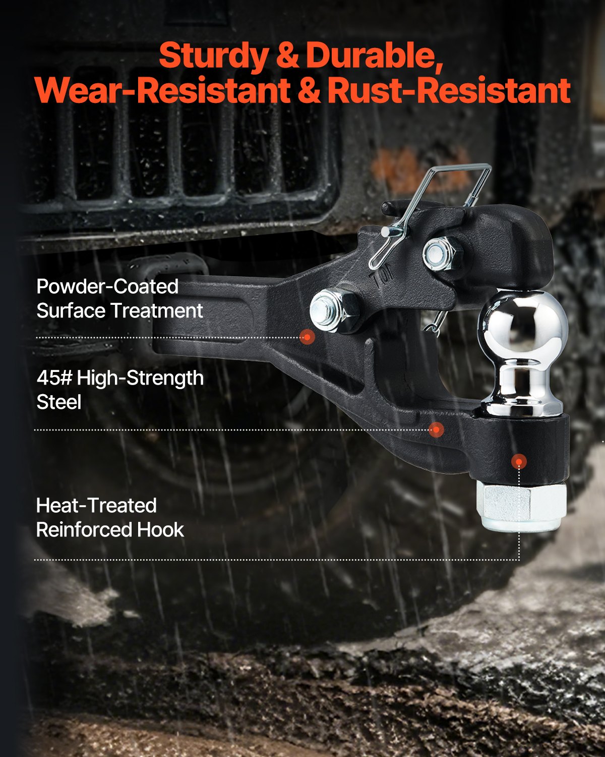 - Premium Durability: The pintle hook hitch is constructed from high-quality steel with a solid one-piece design and features a powder-coated surface that enhances rust and wear resistance. Additionally, the heat-treated hook further increases its lifespan.