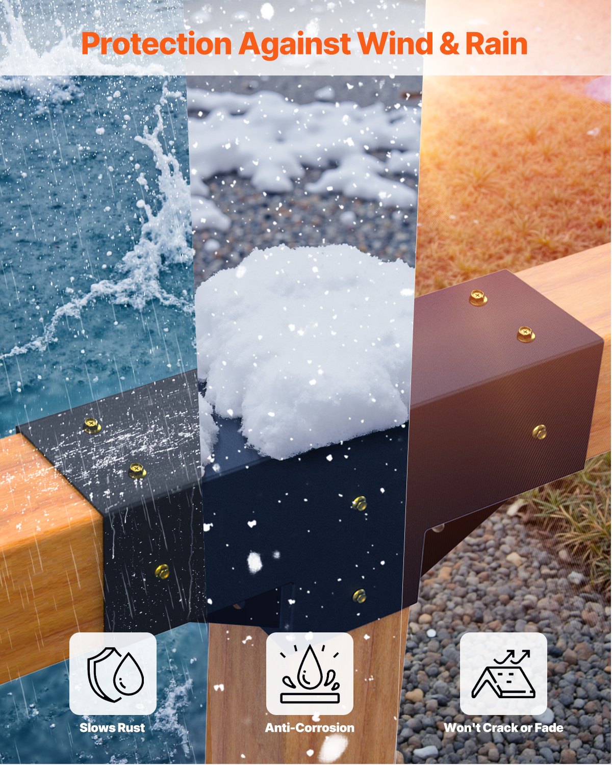 - Built to Last: These 4x4 pergola brackets are made from 2 mm thick carbon steel with a black powder-coated finish that enhances durability. The full-wrap design helps avoid cracking, warping, and water damage for long-term stability