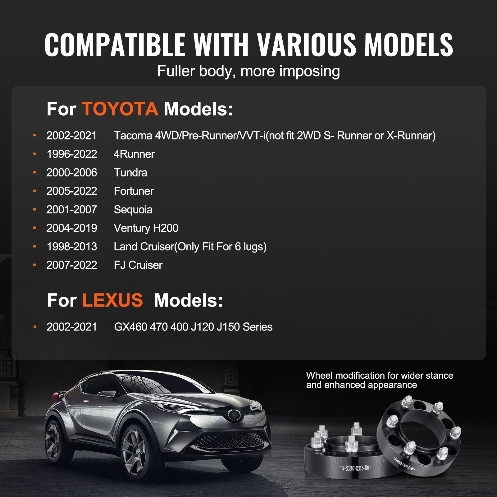 - Wide Compatibility: These wheel spacers are compatible with many Toyota and Lexus vehicles from 1996 to 2022, including: Toyota: 2002-2021 Tacoma 4WD/Pre-Runner/VVT-i (not fit 2WD S-Runner or X-Runner), 1996-2022 4Runner, 2000-2006 Tundra, 2005-2022 Fortuner, 2001-2007 Sequoia, 2004-2019 Ventury H200, 1998-2013 Land Cruiser (Only Fit For 6 lugs), 2007-2022 FJ Cruiser. Lexus: 2002-2021 GX460 470 400 J120 J150 Series.