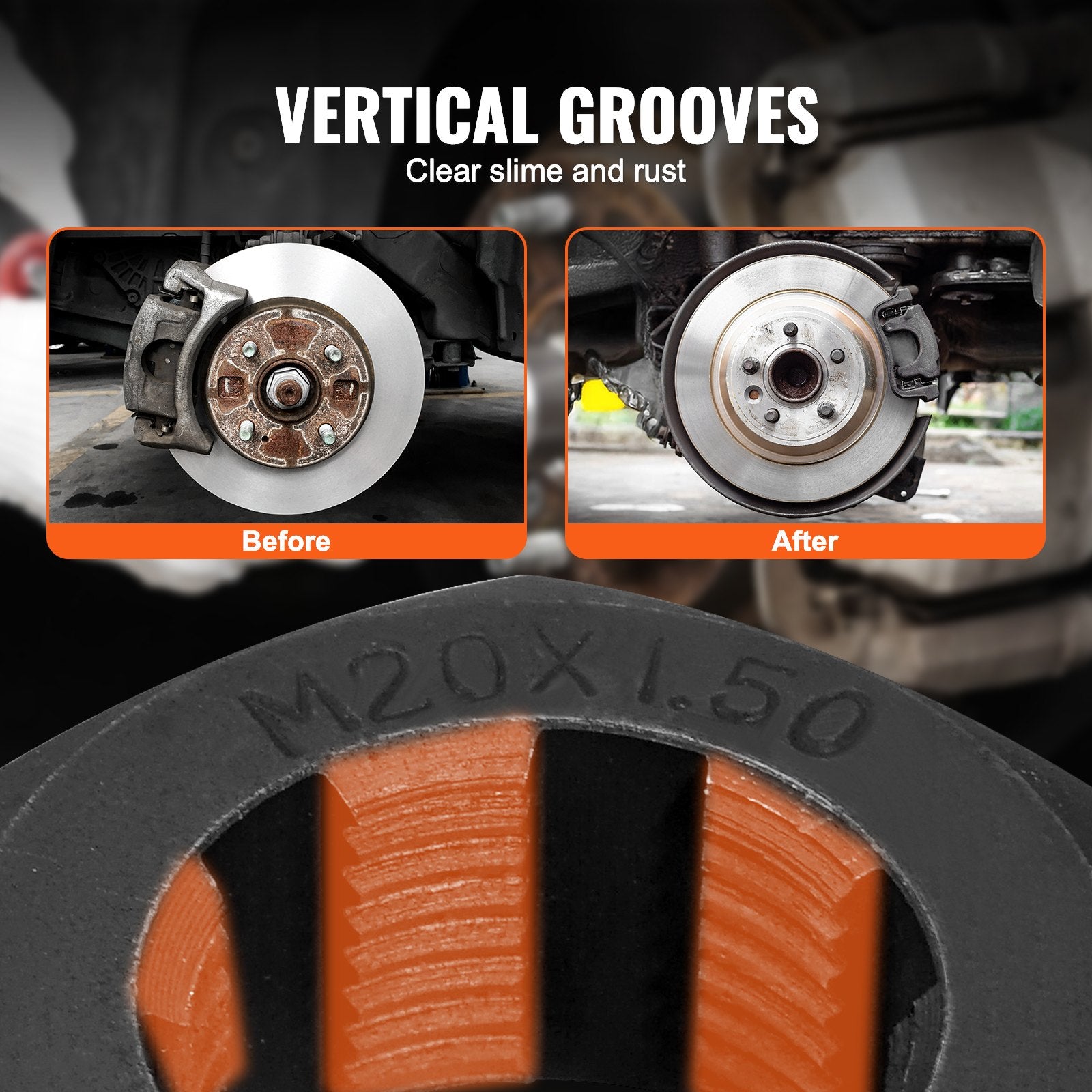 - Complete Size Range: The axle spindle rethreading tool kit includes M20 x 1.25, M20 x 1.50, M22 x 1.00, M22 x 1.50, M24 x 1.50, M24 x 2.00, 13/16 inch x 20 UNF, 3/4 inch x 20 UNF, and a 27mm extension bar. Perfect for cleaning or repairing spindle threads, axle studs, and wheel stud threads.