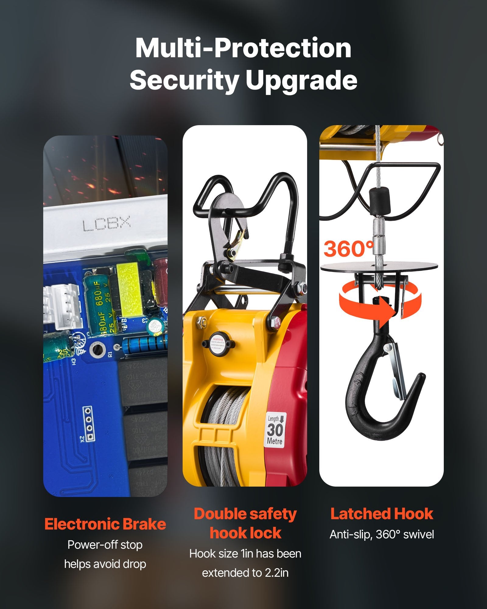 - Multi-Layer Security Protection: This electric hoist winch combines electronic and mechanical brakes for confident stopping. A limit switch and 360° latch hook add security, and the motor auto-stops at power loss or top limit to help avoid drops