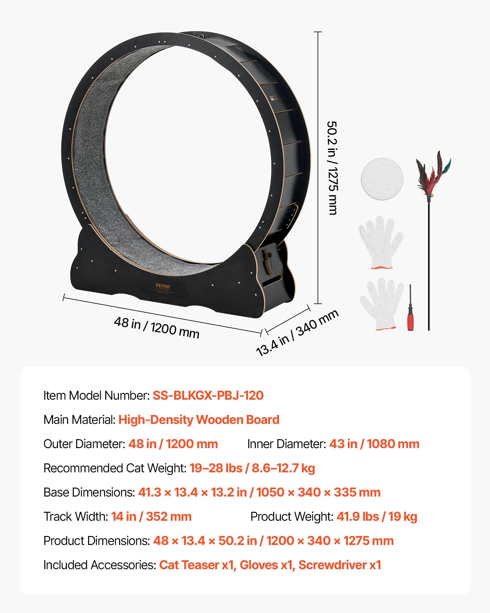 - Spacious for Medium to Large Cats: Measuring 48 in/1200 mm outer diameter and 43 in /1080 mm inner diameter, this cat exercise wheel supports cats up to 28 lbs. With 14 in wide track, it provides ample space for medium to large cats. It helps increase exercise, burn energy, or aid in weight loss for overweight cats to maintain health