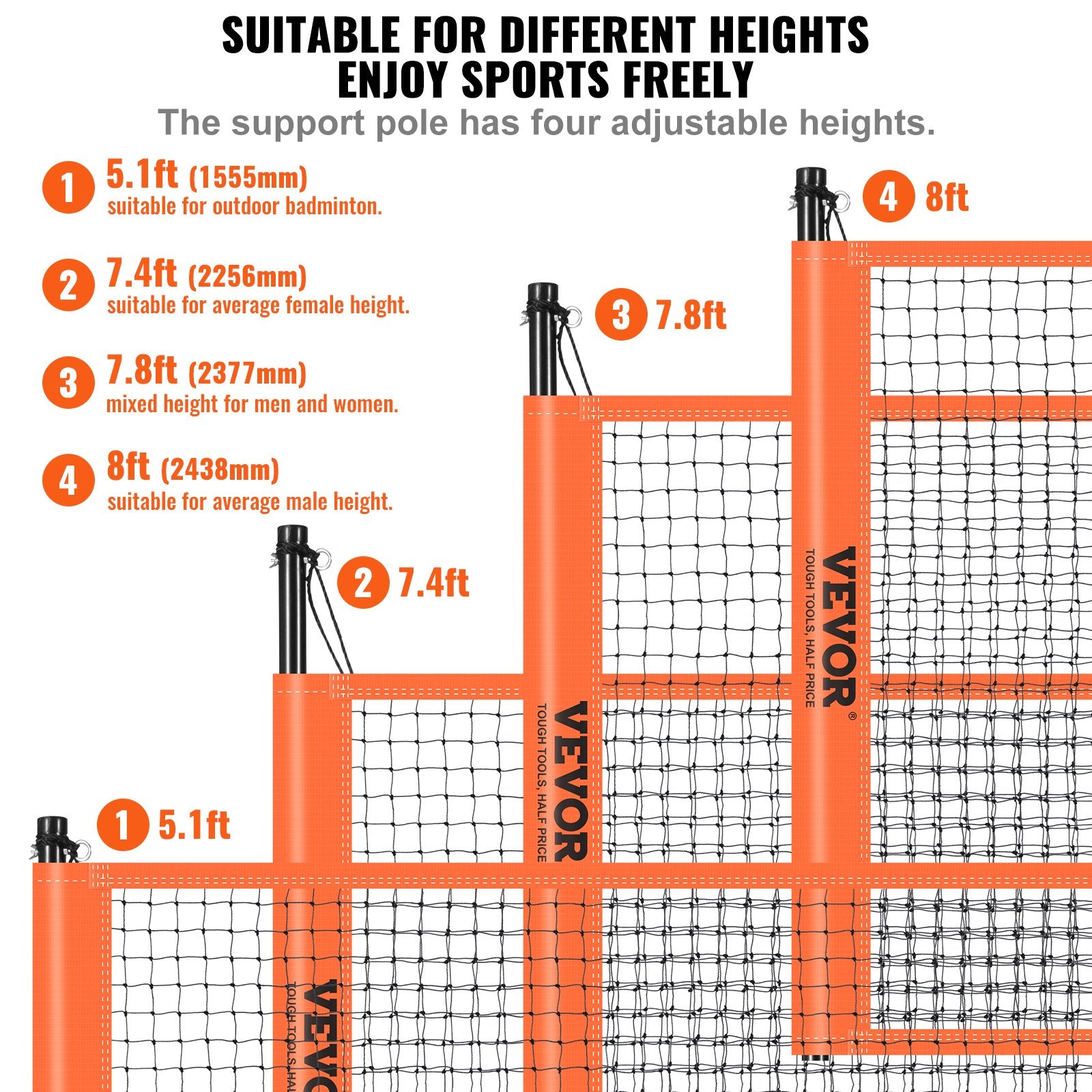 - Easily Adjustable Height: The support pole features four adjustable heights: 5.1ft (1555mm), 7.4ft (2256mm), 7.8ft (2377mm), and 8ft (2438mm), making it suitable for outdoor badminton for average height females, males, and mixed users.