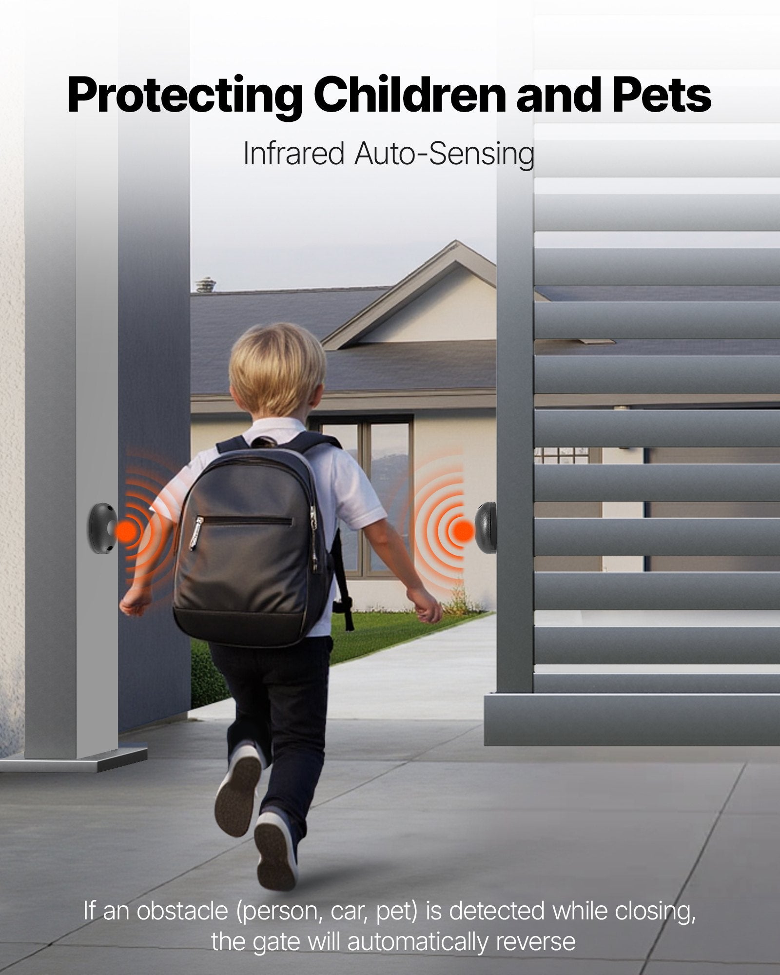 - Smart Safety Features: The automatic gate opener is equipped with infrared sensors. When the infrared sensor detects a person or vehicle, the gate automatically reverses to prevent accidental collisions, and ensures security of your kids and pet.