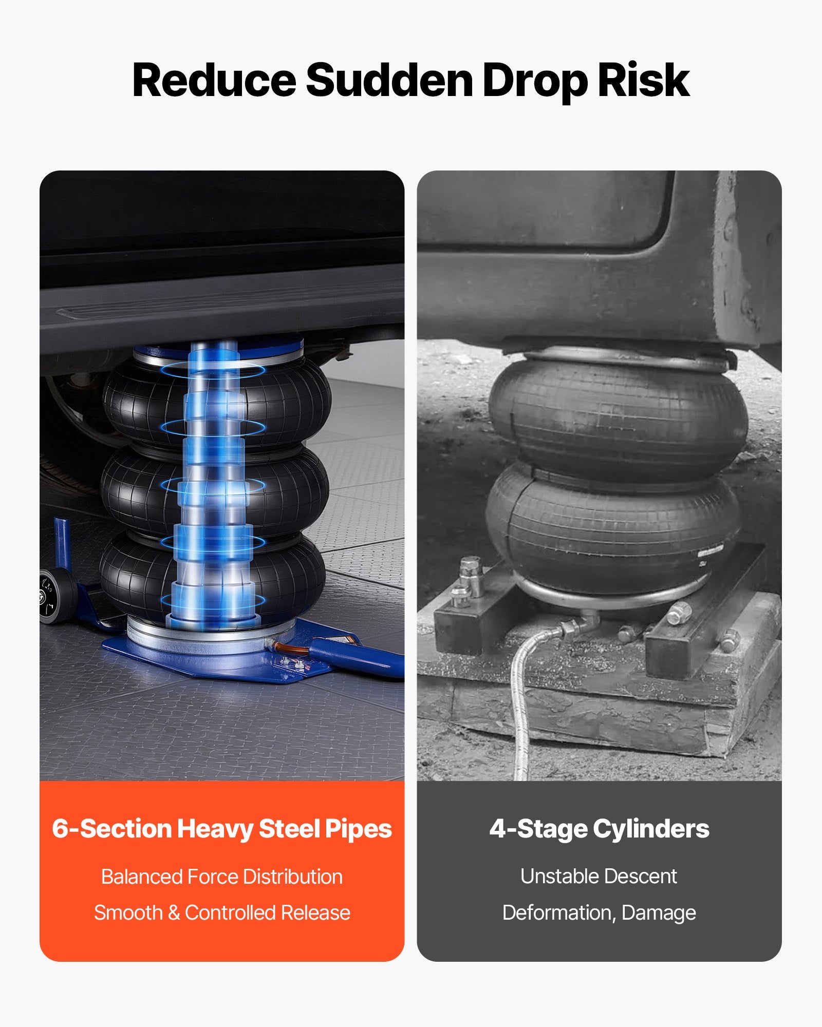 - Controlled & Safe Descent: The air bag jack features six heavy-duty steel pipes inside, each with a shorter stroke for smooth, steady lowering and precise height control. It stops sudden drops, distributes weight evenly, and avoids deformation or tilting