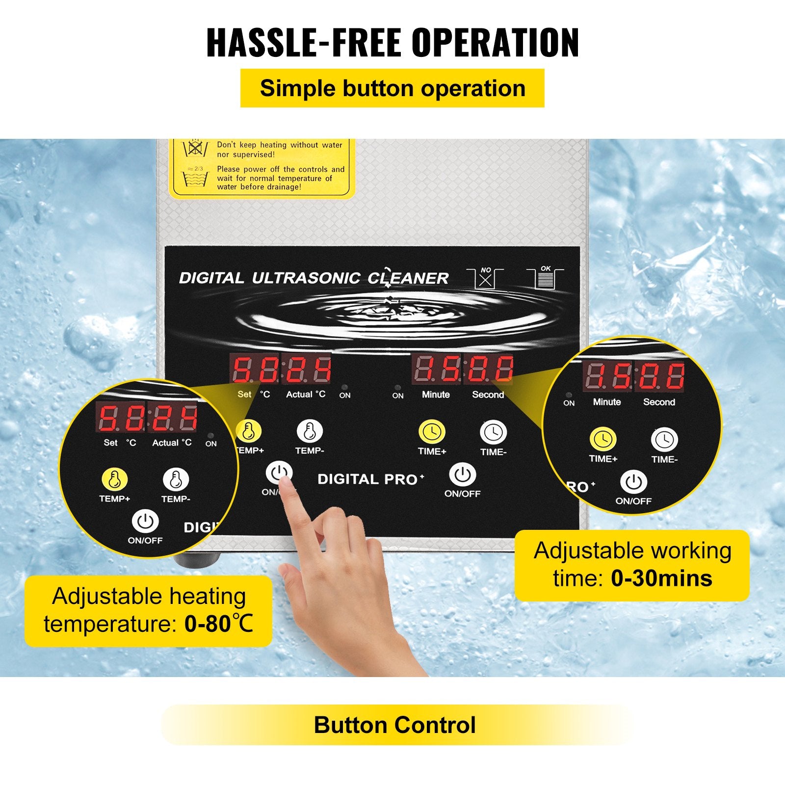 - Timer & Heating: Built-in microcomputer and timer, it supports 0-30 minutes working time select and display. The additional heating function raises the water temperature to 80℃, boosting the cleaning efficiency.