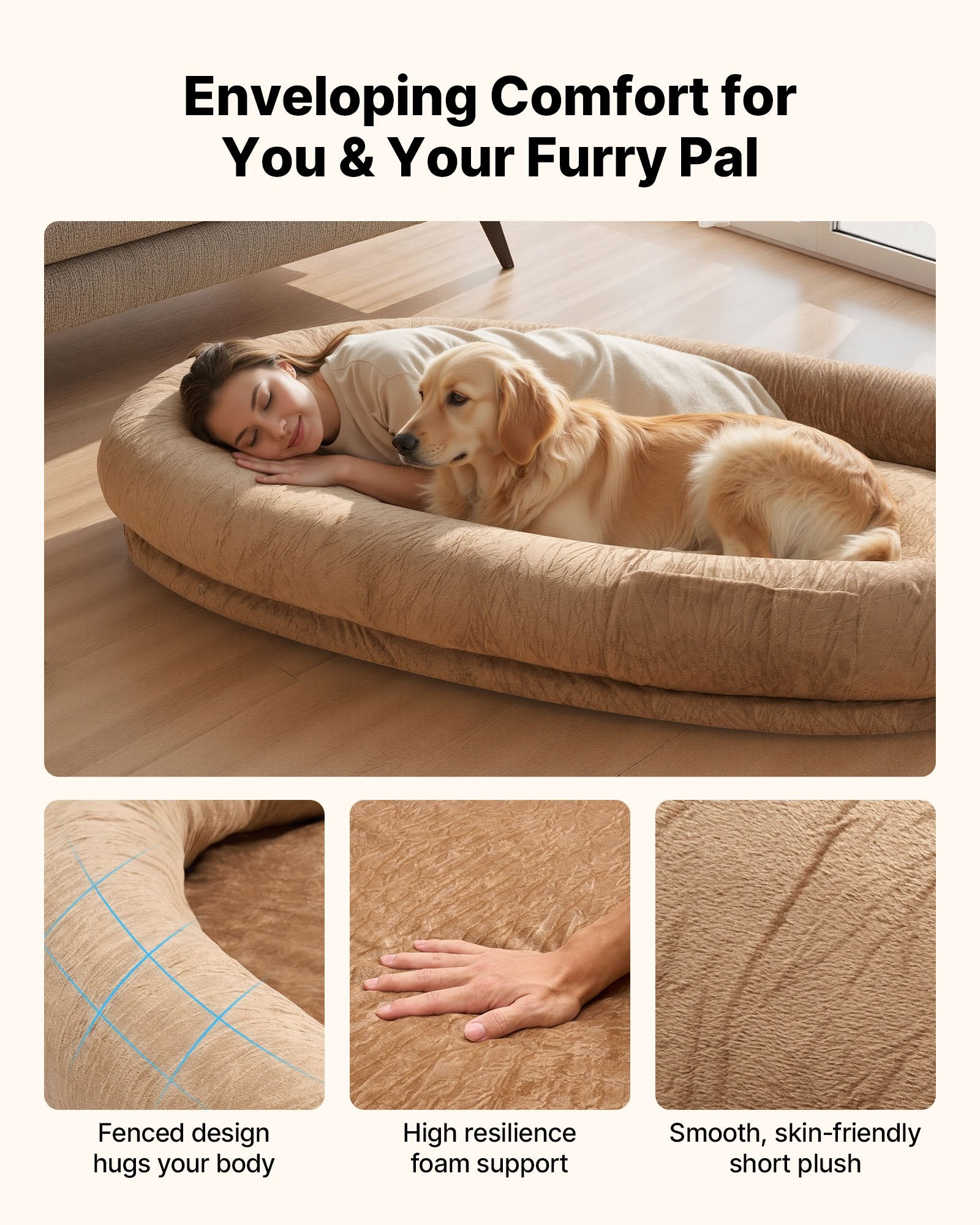 - Cozy Shared Space: At 69.69 x 48.43 x 9.45 inch/1770 x 1230 x 240 mm, our human pet bed for adult features an oval enclosed layout that gently gathers you and your furry friend. From naps to movie time, you both enjoy roomy comfort and a quiet spot that keeps your shared moments relaxed and close