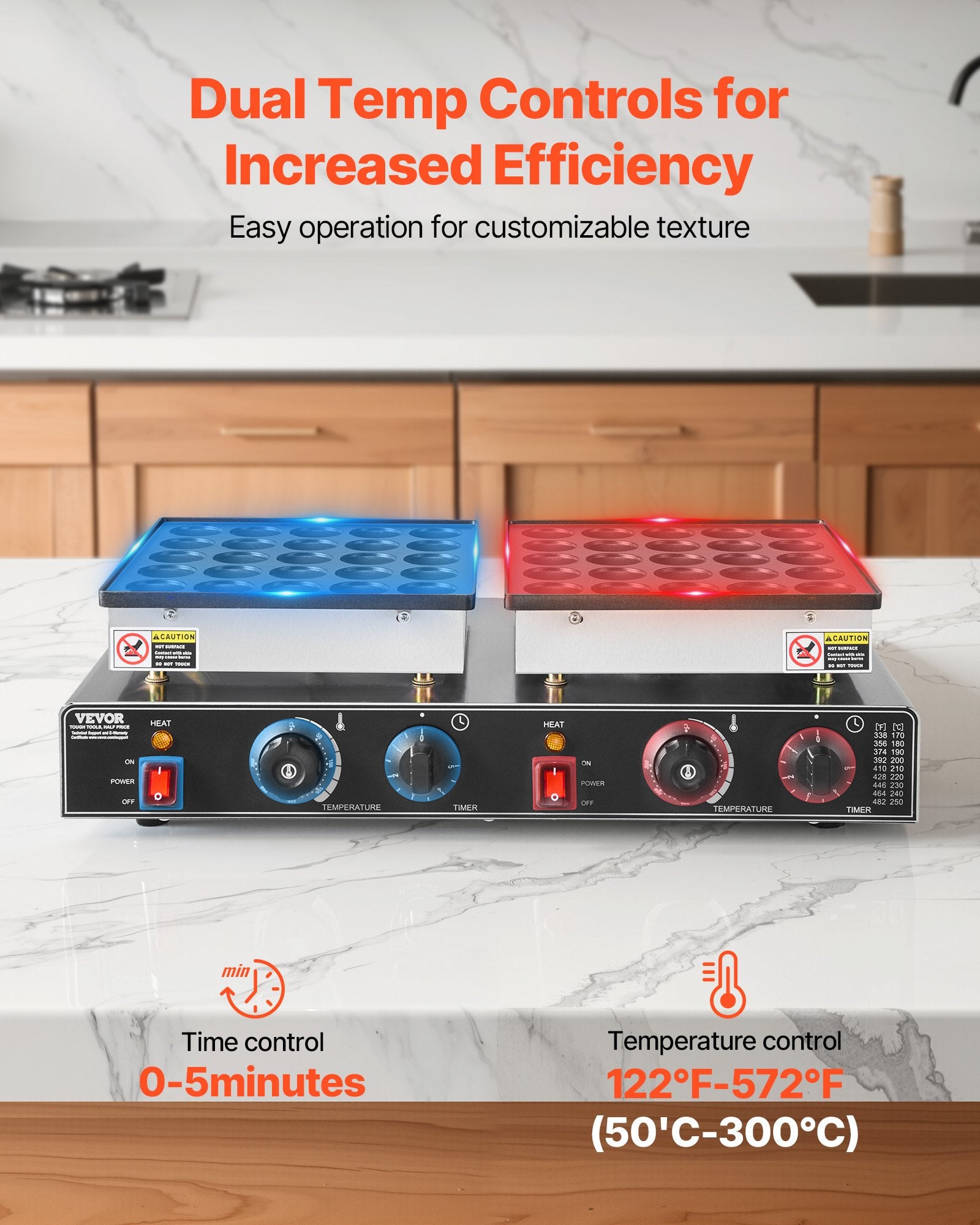 - Dual Temperature Control Design: The dual-grid dorayaki baker machine features independent control panels on both sides, allowing you to adjust the baking pace in two areas freely. With temperature control knobs (122-572°F / 50-300°C), customize it to create personalized waffles, whether you prefer them crispy or fluffy. With individual preparation and audible alerts, it reminds you to add batter and indicates when the waffle is cooked, so you don't have to watch it constantly