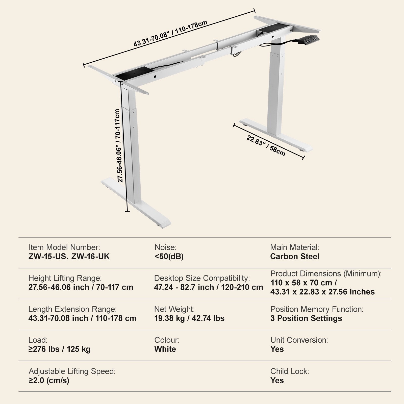 Standing Desk Frame Dual Motor, Adjustable 27.6"-46.1"/70-117 cm Height & 43.3"-70.1"/110-178 cm Length Electric Stand Up Computer Desk Legs, Ergonomic DIY Workstation Base for Home and Office (White Frame Only)
