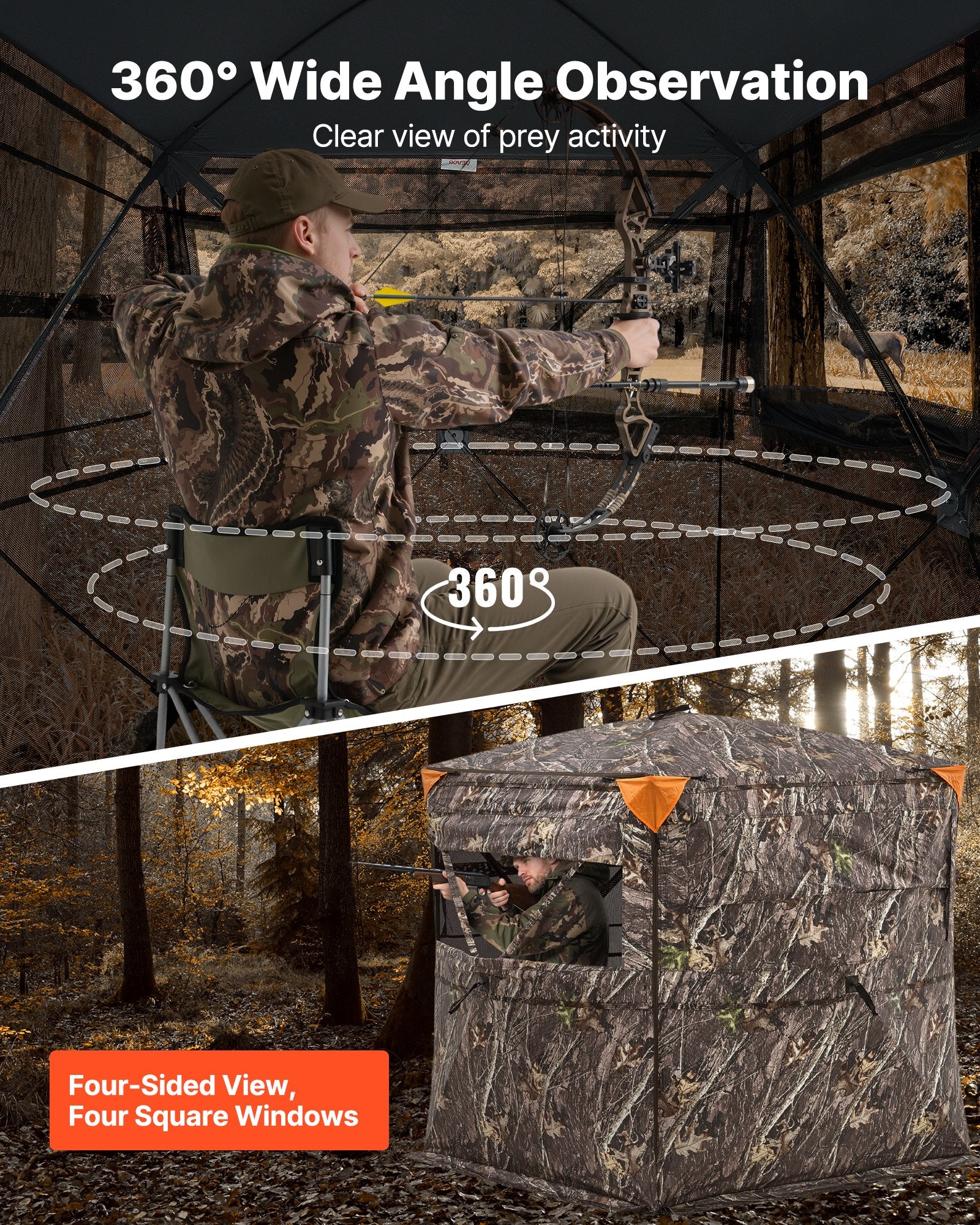 - Silent Hunting Upgrade: The hunting blind uses a silent method with an internal sewn steel bar structure. The side zipper door opens wide for easy entry.The windows and silent slide rails offers 270° or 360° visibility options easy tracking