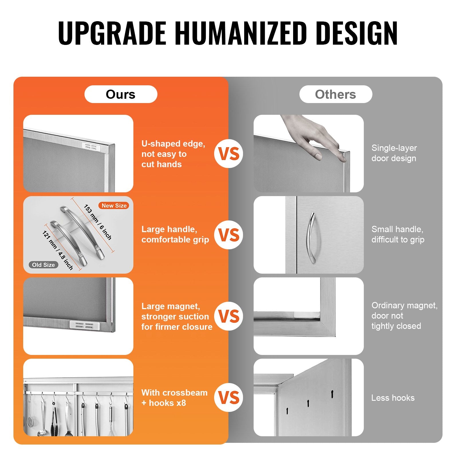 - High-quality Materials: This access door is made of sturdy high-quality stainless steel, rust-proof and waterproof. You can clean it well without leaving any traces. The integrated thickened frame structure is durable, with a fully seamless design, no sharp corners. The unique U-shaped panel structure provides better strength and durability. Magnets at the top and bottom keep the cabinet tightly closed, effectively preventing insects from accessing your food or anything inside the cabinet.