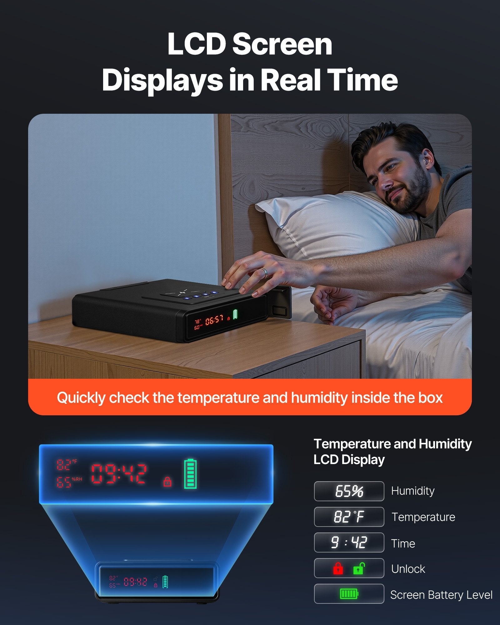 - Temperature & Humidity Display: The gun safe features an LCD to quickly and accurately monitor temperature and humidity. Easily check battery level and add a desiccant if humidity is high