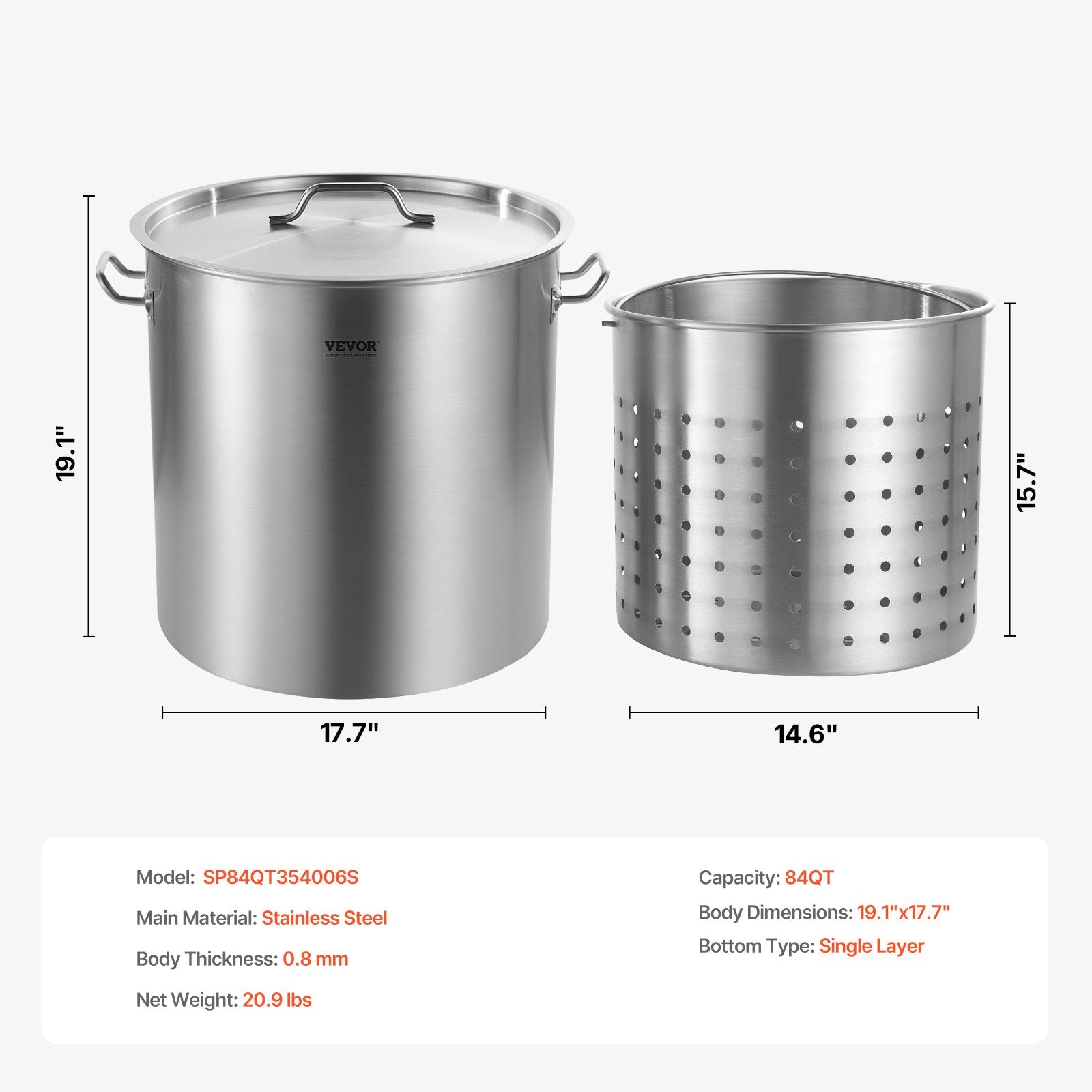 - 84 QT / 79.5 L Large Capacity: The internal dimensions of the pot are 17.7" x 19.1" / 450 x 485 mm. It can be used for steaming large lobsters, frying turkeys, boiling soups, stewing dishes, and more, making it suitable for restaurant kitchens and families that frequently host gatherings.