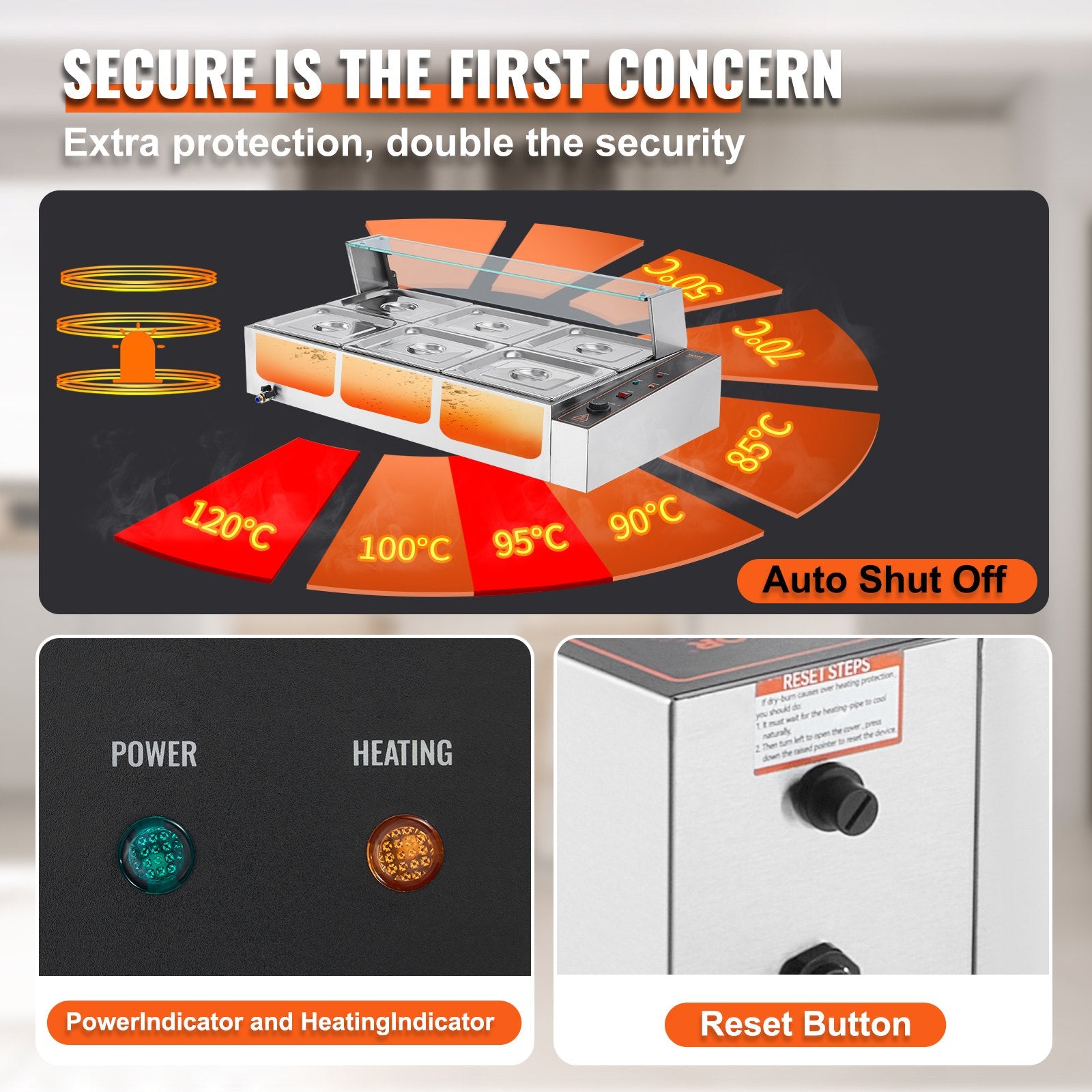 - Additional Security: We have upgraded our food warmer with newly designed "Dry Burning Indicator" and "Reset Button". The dry-burning indicator function automatically stops heating the food when the temperature exceeds 248°F (120°C). To resume operations, you need to press the Reset Button.