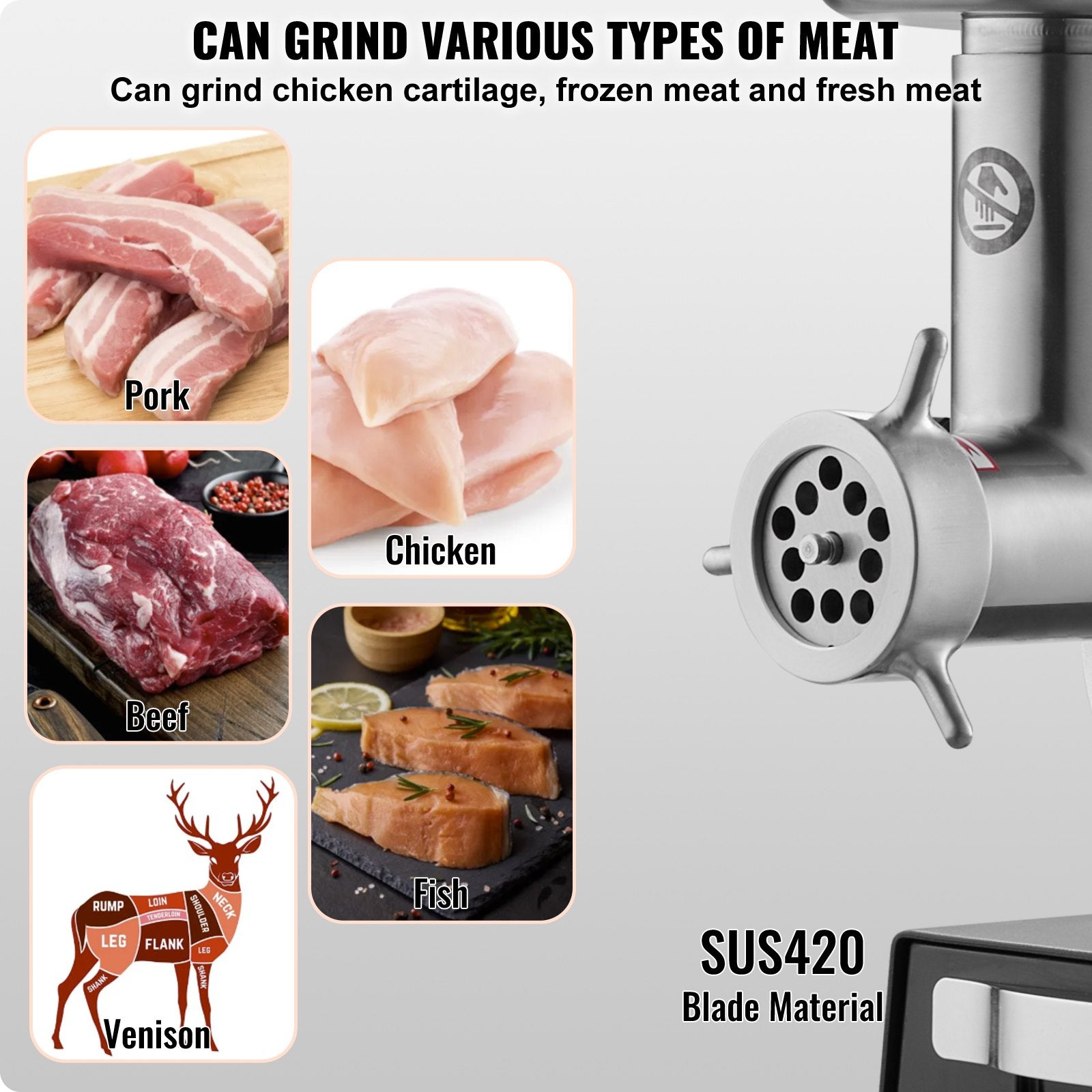 - Versatile Accessories: Our commercial meat grinders come with 2*cross blades(one in grinder itself), 1*4.5mm meat grinder blade plate, 1*sausage stuffing plate, and 3*sausage stuffing tubes(0.47", 0.63",0.87" OD), 1*meat pounding stick, 1*cleanning brush, 1*machine head locking handle.