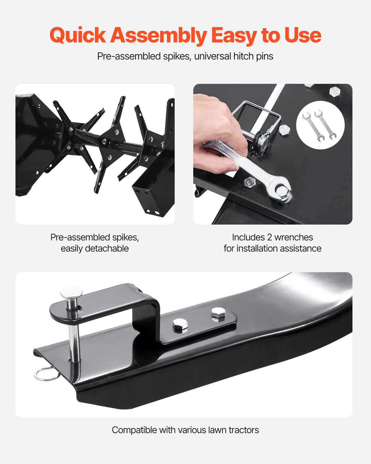 - Quick Installation: Our lawn aerator tow behind comes with pre-installed spikes and includes 2 wrenches for easy setup. You can start using it right away upon delivery. The package also includes a detailed manual for clear instructions and security tips.