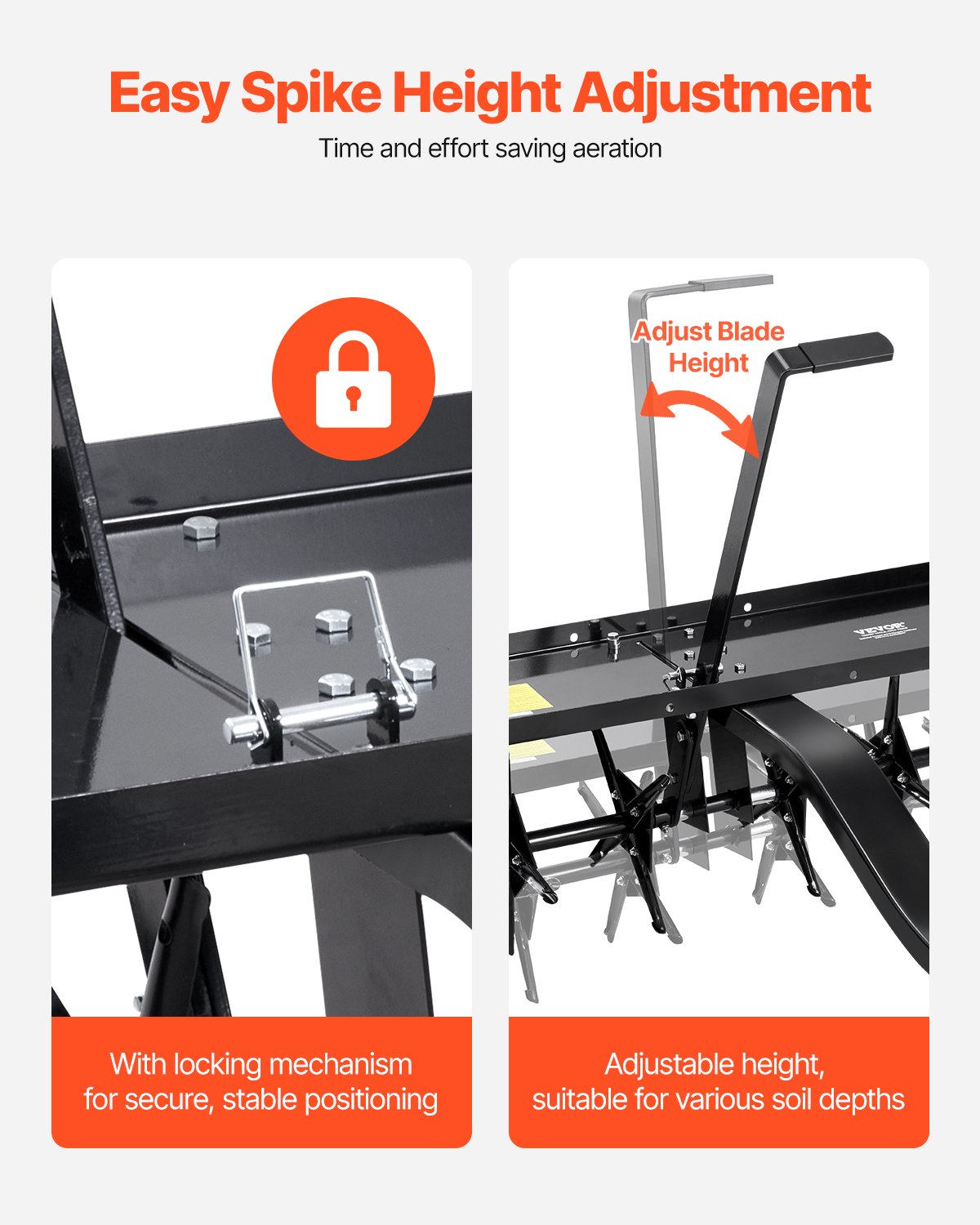 - Adjustable Height: You can adjust the tray height using the lawn aerator’s lift handle to achieve the ideal penetration depth or suit different soil heights. The locking mechanism ensures the position stays secure, avoiding any accidental detachment or loosening during use.