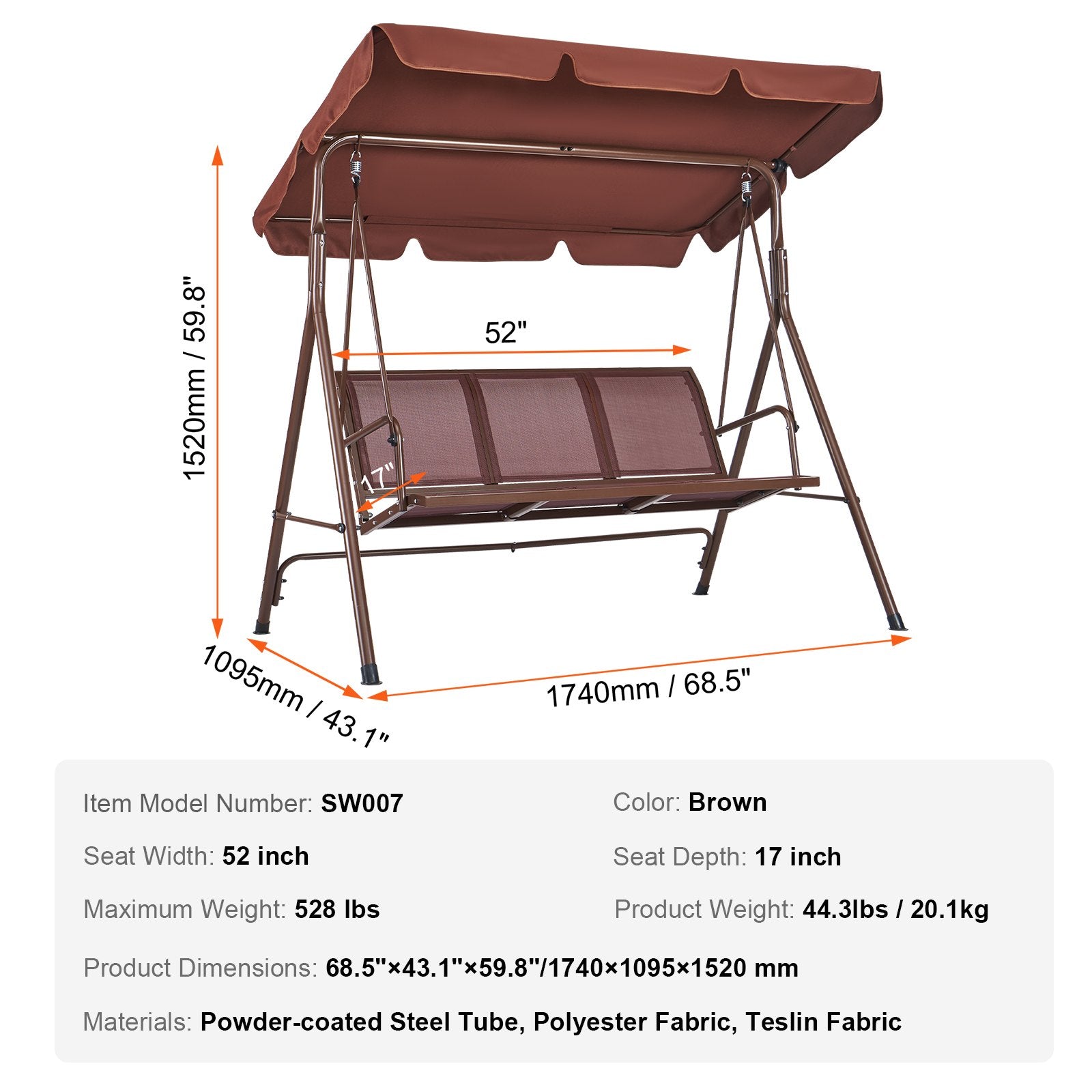 3-Seat Patio Swing Chair, Outdoor Patio Swing with Adjustable Canopy, Porch Swing with Armrests, Teslin Fabric and Alloy Steel Frame, for Balcony, Backyard, Patio, Garden, Poolside, Brown