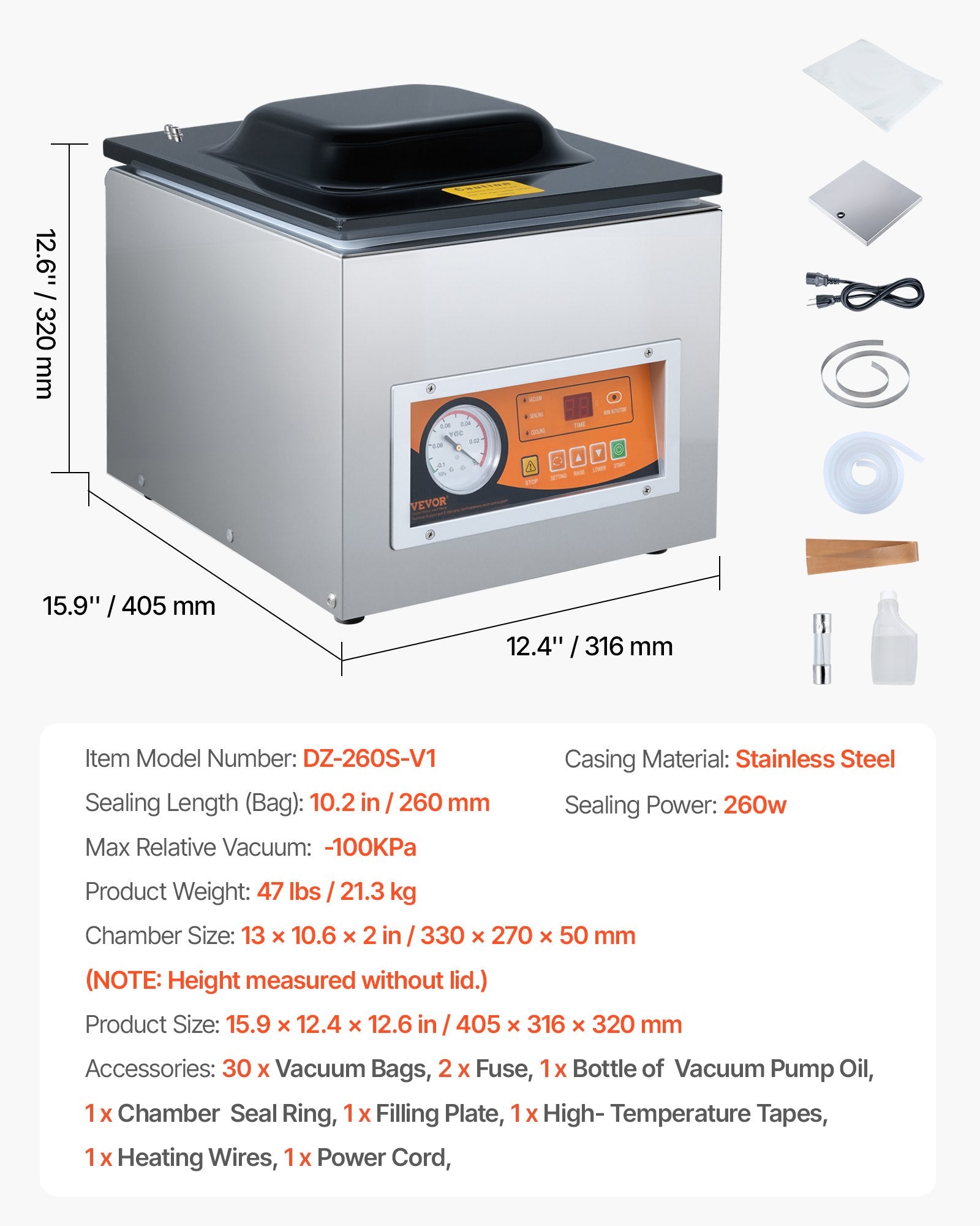 Chamber Vacuum Sealer, 260W Sealing Power, Vacuum Packing Machine for Wet Foods, Meats, Marinades and More, Compact Size with 260 mm Sealing Length, Applied in Home Kitchen and Commercial Use