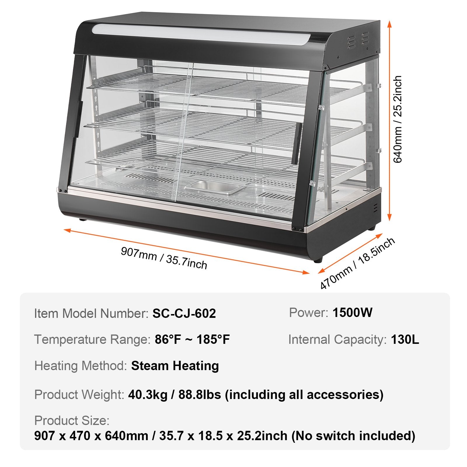 - 3-Tier Large Space: Dimensions: 35.71 x 18.50 x 25.20 inch / 907 x 470 x 640 mm. Our countertop food display case features 3 spacious food-grade shelves, allowing you to place different sizes of food freely. It is ideal for holding and storing pizza, egg tarts, fried chicken, or burgers, ensuring the food stays fresh for a long time.