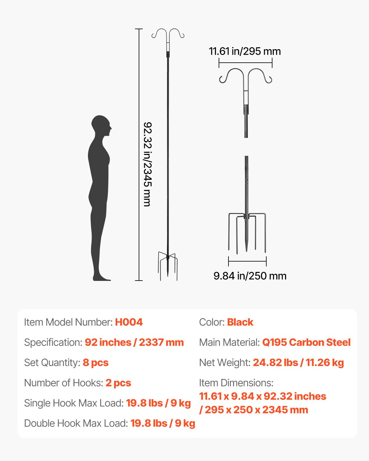 Double Shepherds Hooks for Outdoor, 8 Pack 2345 mm Heavy Duty Bird Feeder Pole, 19 mm Thick Garden Hooks for Hanging Hummingbird Feeder, Plant Baskets, Solar Light Lanterns,Wind Chimes