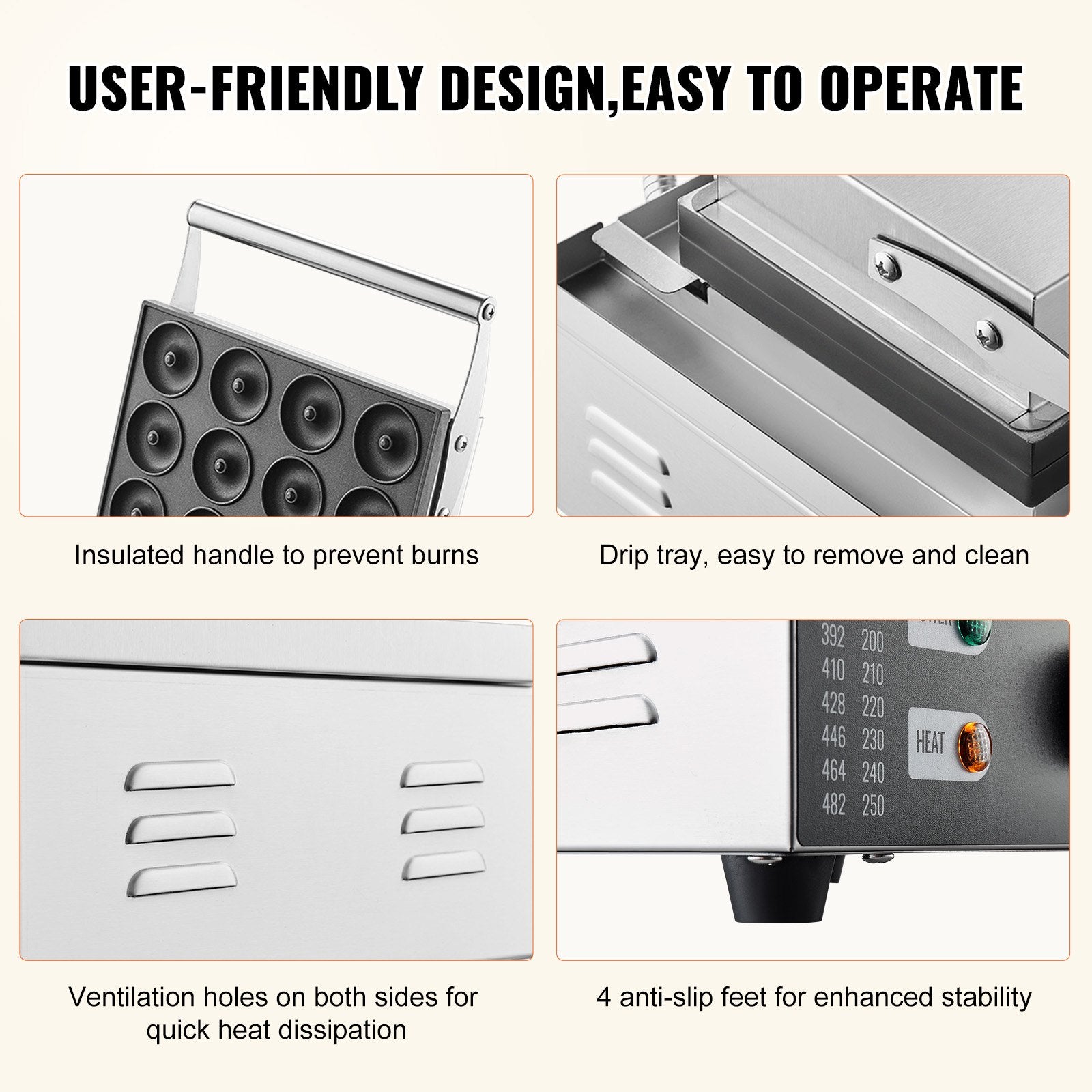- User-centric Design: Our commercial waffle donut machine features include a heat-resistant stainless steel handle to prevent burns. A drip tray that's easy to detach for cleaning. Side vents for faster cooling, ensuring the machine works efficiently. Anti-slip feet for stability and usability of the donut maker.