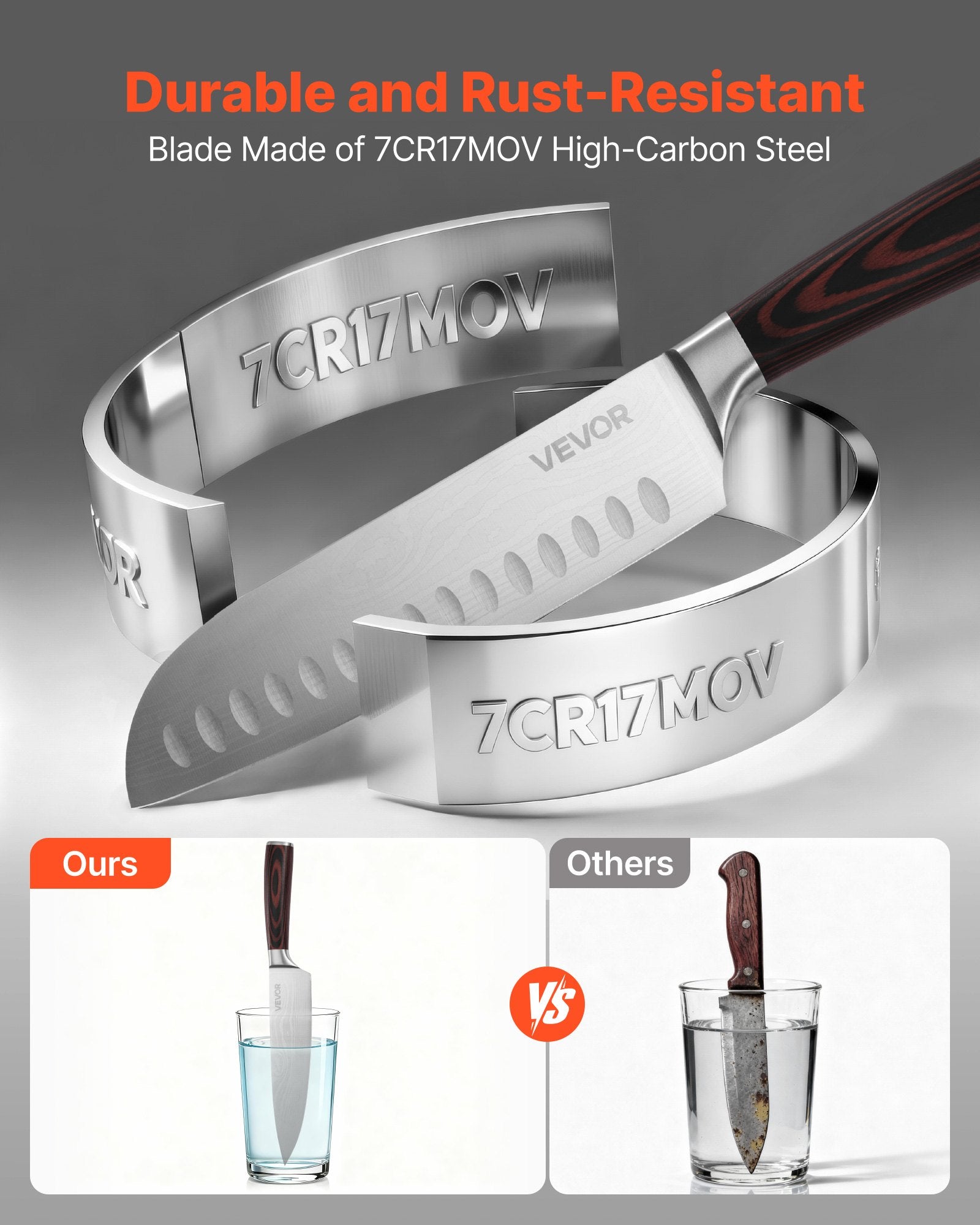 - Durable & Rust-Resistant: Made of 7CR17MOV high-carbon stainless steel, this knife block set offers hardness and toughness, avoiding chipping or cracking. The blades are oil-quenched and polished to pass salt spray tests, ensuring a rust-resistant surface and long-lasting sharpness even in humid kitchens